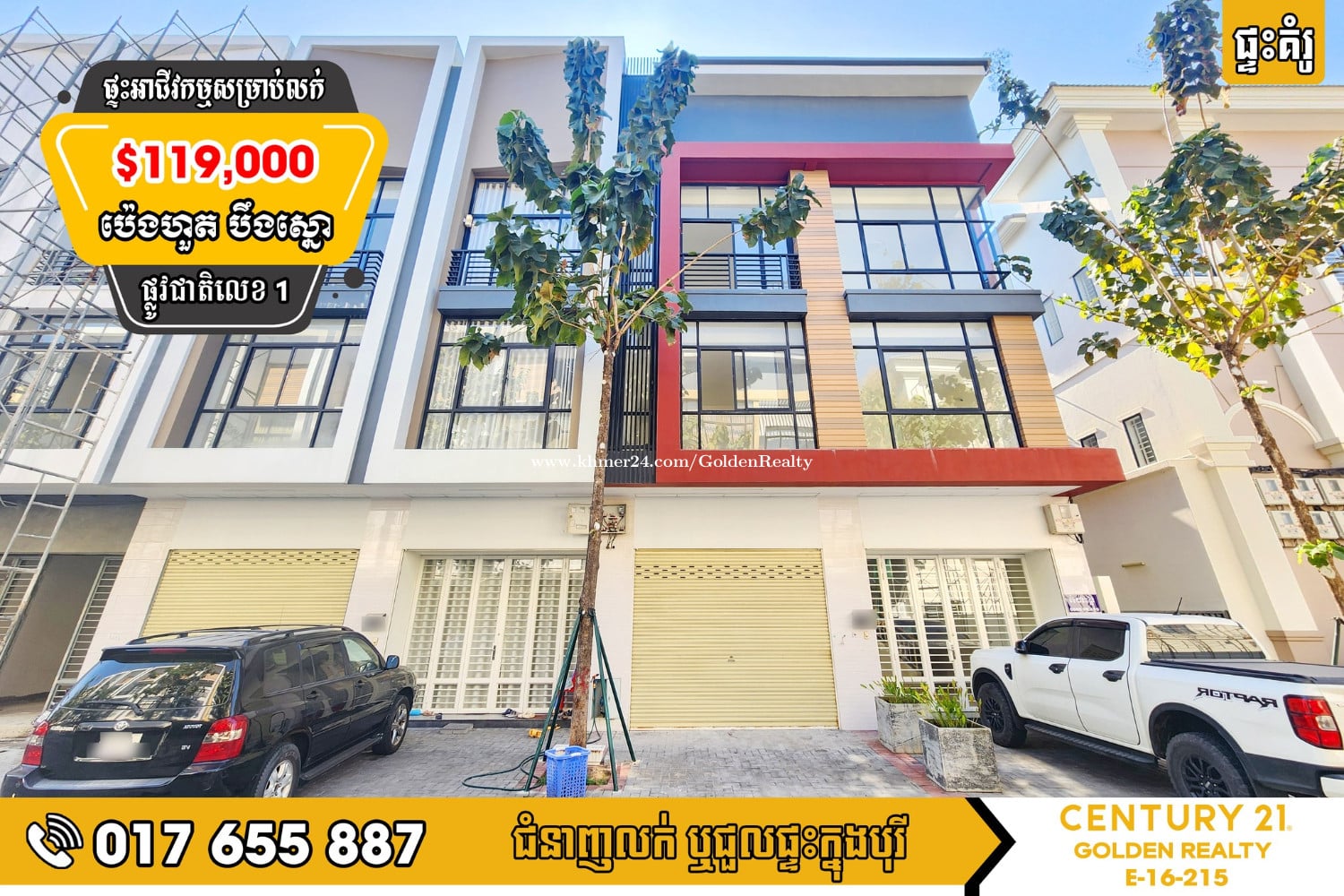 #ផ្ទះអាជីវកម្ម SH-D សម្រាប់លក់ ក្នុងបុរីប៉េង ហួតបឹងស្នោរ ផ្លូវជាតិលេខ 1 * តម្លៃលក់ $119,000 (ចរចាបាន) * ផ្ទេរឈ្មោះប្លង់ត្រឹមបុរី * ទំហំផ្ទះ 4.2m x 10m * ទំហំដី 4.2m x 17m * បន្ទប់គេង 4 | បន្ទប់ទឹក 5 ☎សំរាប់ព័ត៍មានលម្អិតសូមទំនាក់ទំនងទូរស័ព្ទលេខៈ Tel: 017655xxxClick To Call / 099655xxxClick To Call / 0236558xxxClick To Call 📩Telegram t.me/c21goldenrealtyhotline