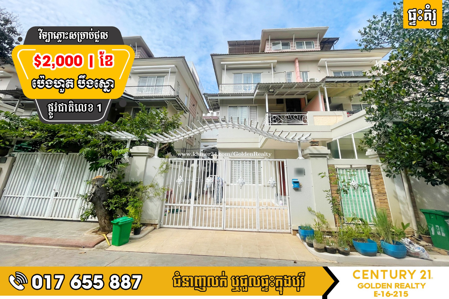 #វីឡាភ្លោះ Twin A សម្រាប់ជួល ក្នុងបុរីប៉េង ហួតបឹងស្នោរ ផ្លូវជាតិលេខ1 - តម្លៃជួល $2000 - ទំហំដី 15.4m x 21m - ទំហំផ្ទះ 12m x 12m - បន្ទប់គេង 8 | បន្ទប់ទឹក 10 - មានសម្ភារះក្នុងផ្ទះមួយចំនួនជូន - ផ្ទះបែរទិសខាងត្បូង ☎សំរាប់ពត៍មានលម្អិតសូមទំនាក់ទំនងមកទូរស័ព្ទលេខៈ Tel: 017655xxxClick To Call / 099655xxxClick To Call / 0236558xxxClick To Call 📩Telegram t.me/c21goldenrealtyhotline