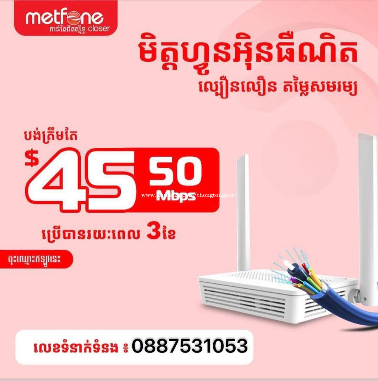 #Affordable WiFi โ Metfone WiFi, fast, stable, and budget-friendly ๐ Monthly WiFi Packages: โ $15/month โ 50 Mbps โ $18/month โ 60 Mbps โ $25/month โ 85 Mbps โ $35/month โ 120 Mbps ๐ Why choose us? โ๏ธ Fast and stable speed โ๏ธ Affordable price for everyone โ๏ธ Quick installation by local technicians ๐ฒ Register now! ๐WhatsApp: +855887531053 ๐ Telegram: https://t.me/Tonghort_Metfone_WiFi ๐ Fast installation โ service at your location ๐ถ Great service โ stable connection 24/7