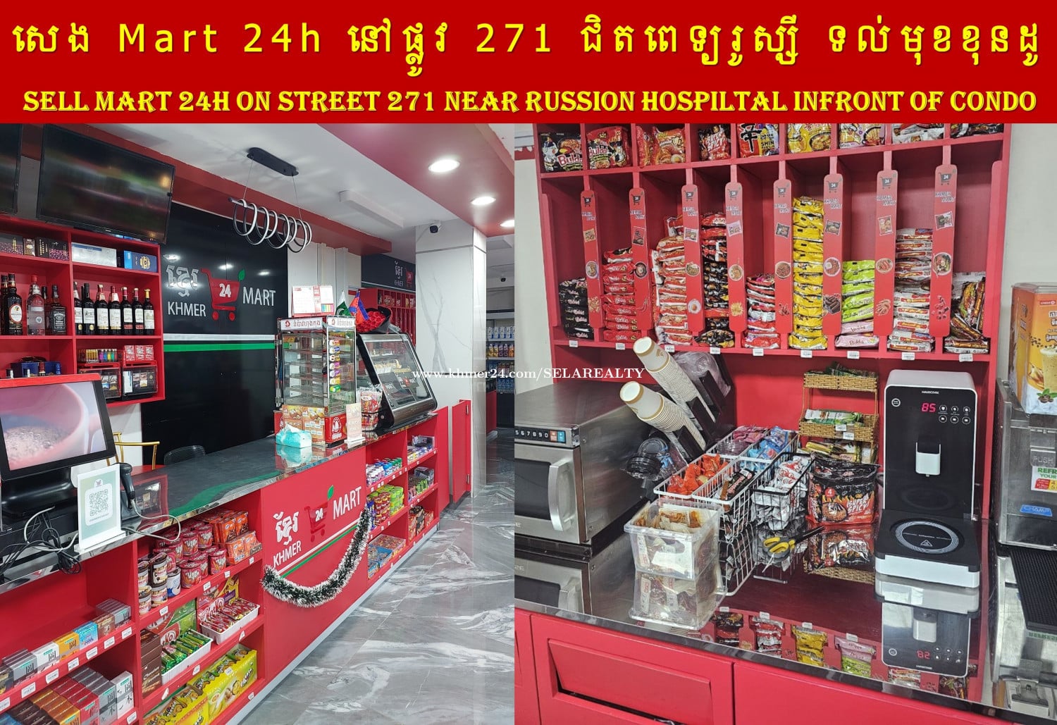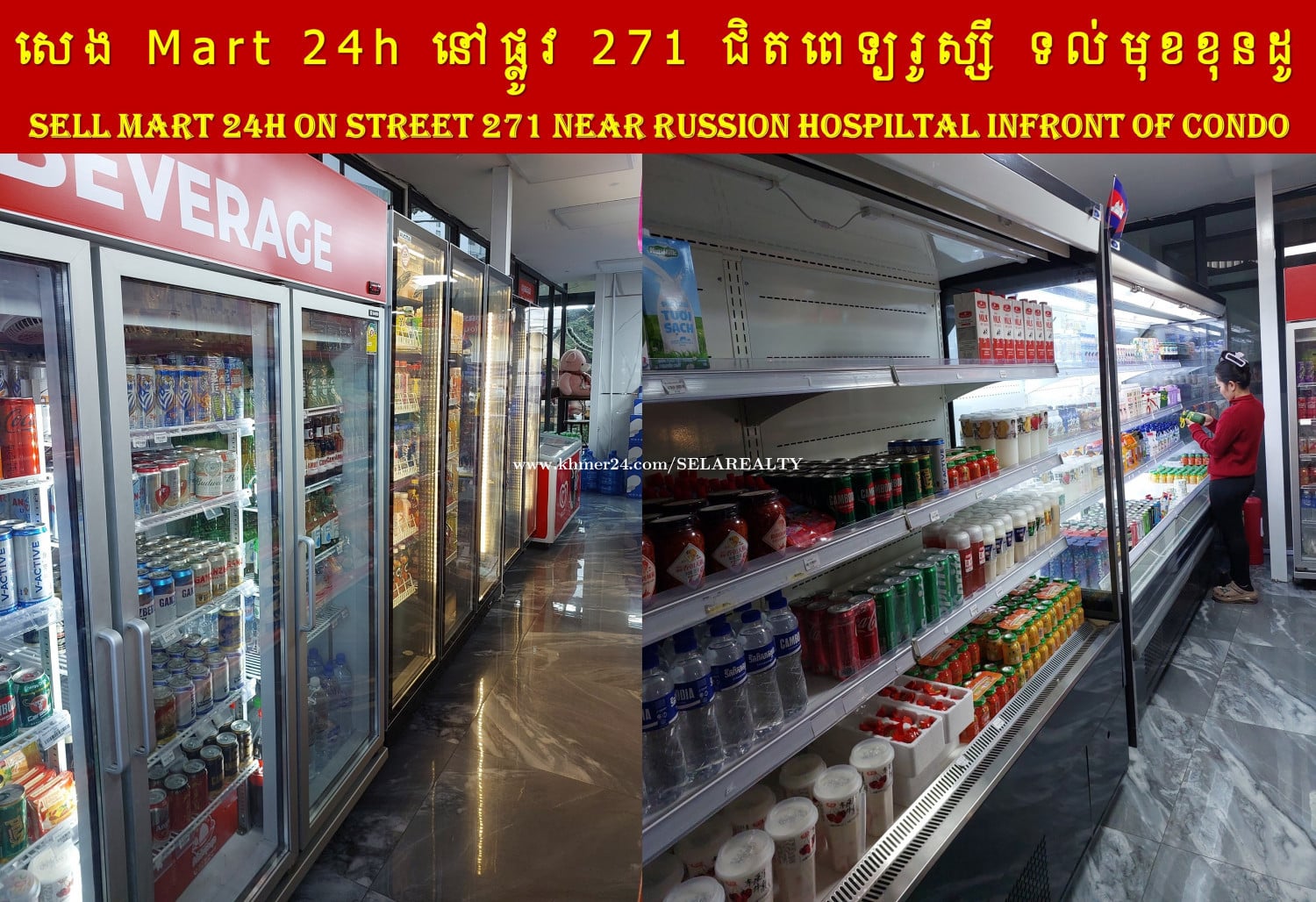 #BS001 (Khmer & Eng) »»» អាជីវកម្ម សម្រាប់លក់ Mart 24h នៅផ្លូវ ២៧១ ជិតពេទ្យរូស្សី ទល់មុខខុនដូ និង សាលារៀន | Mart 24h For Sale On Street 271 Near Russian Hospital, Infront of Condo and School » Mart ទើបដំណើរបានរយៈពេលថ្មីៗ សំភារៈនៅថ្មី ទំនិញពេញ ល្អសម្រាប់ការវិនិយោគបន្ត ... | Mart just opening all equipment are very new, and item full in stock, good for new owner keep the business ... » តម្លៃ៖ ៣៥,០០០ ដុល្លារ (មានលុយកក់ ៤,០០០ ដុល្លារ) | Sale Price 35,000$ (Including Deposit 4,000$) » ឈ្នួលហាង៖ ១,០០០ ដុល្លារ/ខែ, សល់កុងត្រាជួល ៣ឆ្នាំ | Rental 1,000$ per month up to 3 years » តេឡេក្រាម | Telegram: 069239xxxClick To Call, 095799xxxClick To Call, 0713023xxxClick To Call