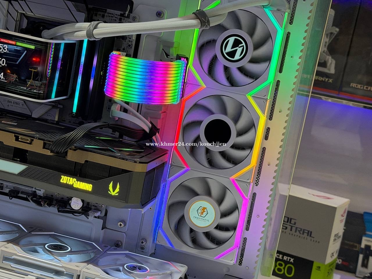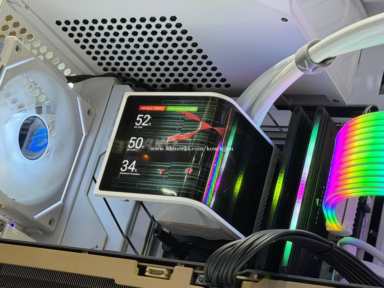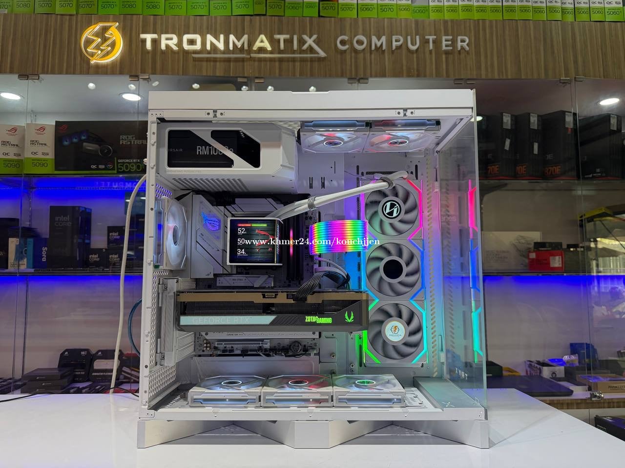 #Pcbuildមួយទឹកនៅស្អាត 99% Cpu : AMD Ryzen 7 9800X3D Ram : Corsair Dominator Platinum 24GBX2 48GB 7200Mhz M.2: crucial P3 1TB M.2: PNY CS2140 2TB + HDD 2TB VGA: Zotac RTX 5080 MB: Rog Strix B850 A Power : Corsair RM1000e 1000w Cooling : TYRX Panorama LCD 360mm Case : TYRX LUCA L70 Fan : LianLi LCD 3 unit / LianLi Normal 6 unit