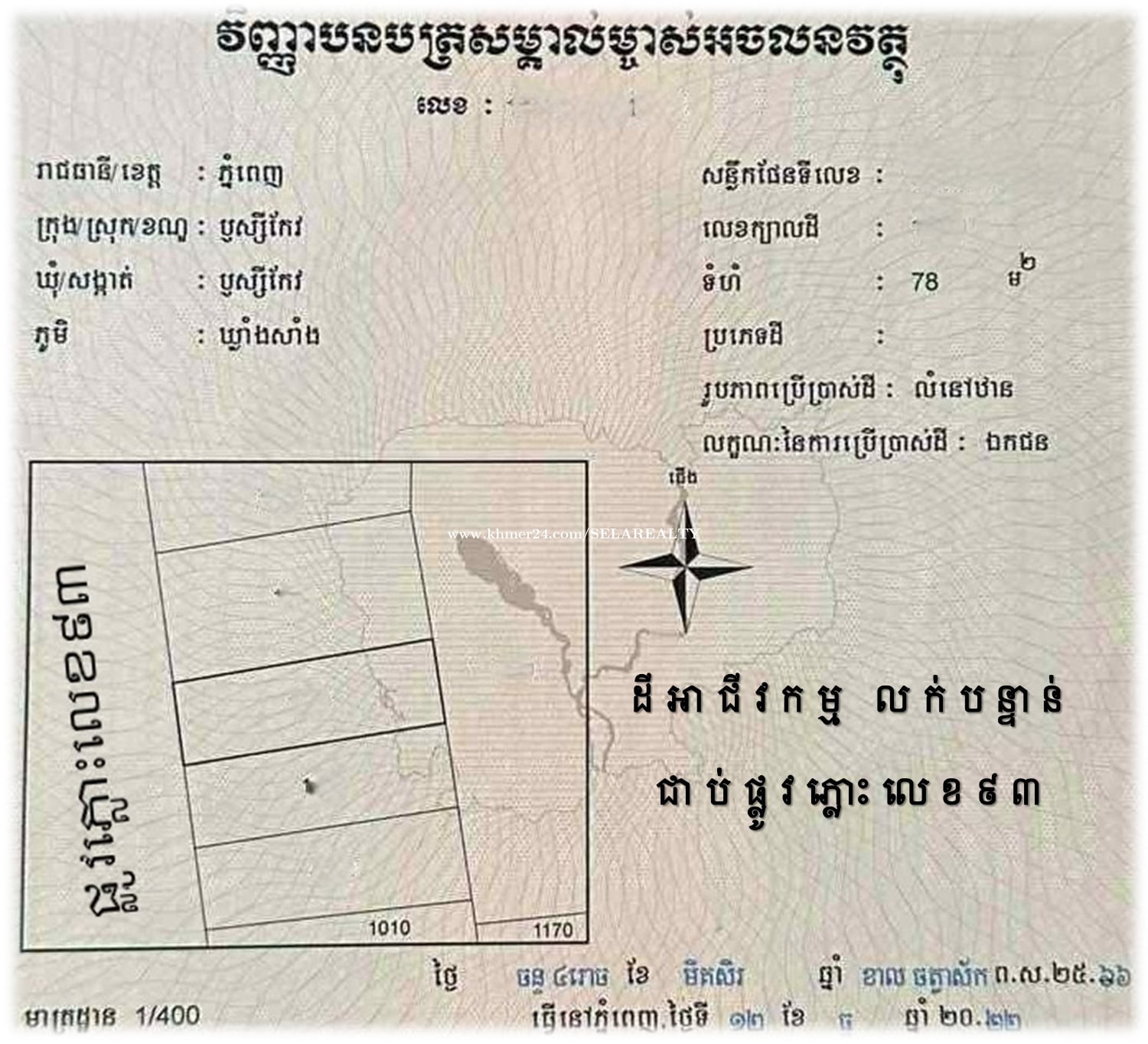 #S04095 »»» ដីអាជីវកម្ម លក់បន្ទាន់ លើផ្លូវភ្លោះ ផ្លូវលេខ៩៣ នៅឬស្សីកែវ » ខ្នាតដី៖ ៥ម គុណ ១៥ម » ទំហំលើប្លង់រឹង៖ ៧៨ ម២ » ទិស៖ លិច » តម្លៃលក់៖ ១៧០,០០០ ដុល្លារ » ផ្ទេរកម្មសិទ្ធិ៖ វិញ្ញាបនបត្រសម្គាល់ម្ចាស់អចលនវត្ថុ ប្លង់រឹង LMAP » ស្ថិតនៅ៖ ភូមិឃ្លាំងសាំង សង្កាត់ឬស្សីកែវ ខណ្ឌឬស្សីកែវ រាជធានីភ្នំពេញ 👉 ទំនាក់ទំនងជាមួយភ្នាក់ងារទទួលសិទ្ធិលក់ផ្តាច់មុខ៖ 069239xxxClick To Call | 095799xxxClick To Call | 0713023xxxClick To Call 👉 គ្រុបតេឡេក្រាម៖ https://t.me/+LxD_l_Ua3IA5NTI9 👉 តាមដានបណ្តាញសង្គមយើងខ្ញុំ៖ https://linko.page/sz66qj64k6gv #SELAREALTY #BPR_Team #Land #House #Villa #Condo #Consultant #SALE #RENT #LEASE #BUY #Property #PhnomPenh #Cambodia