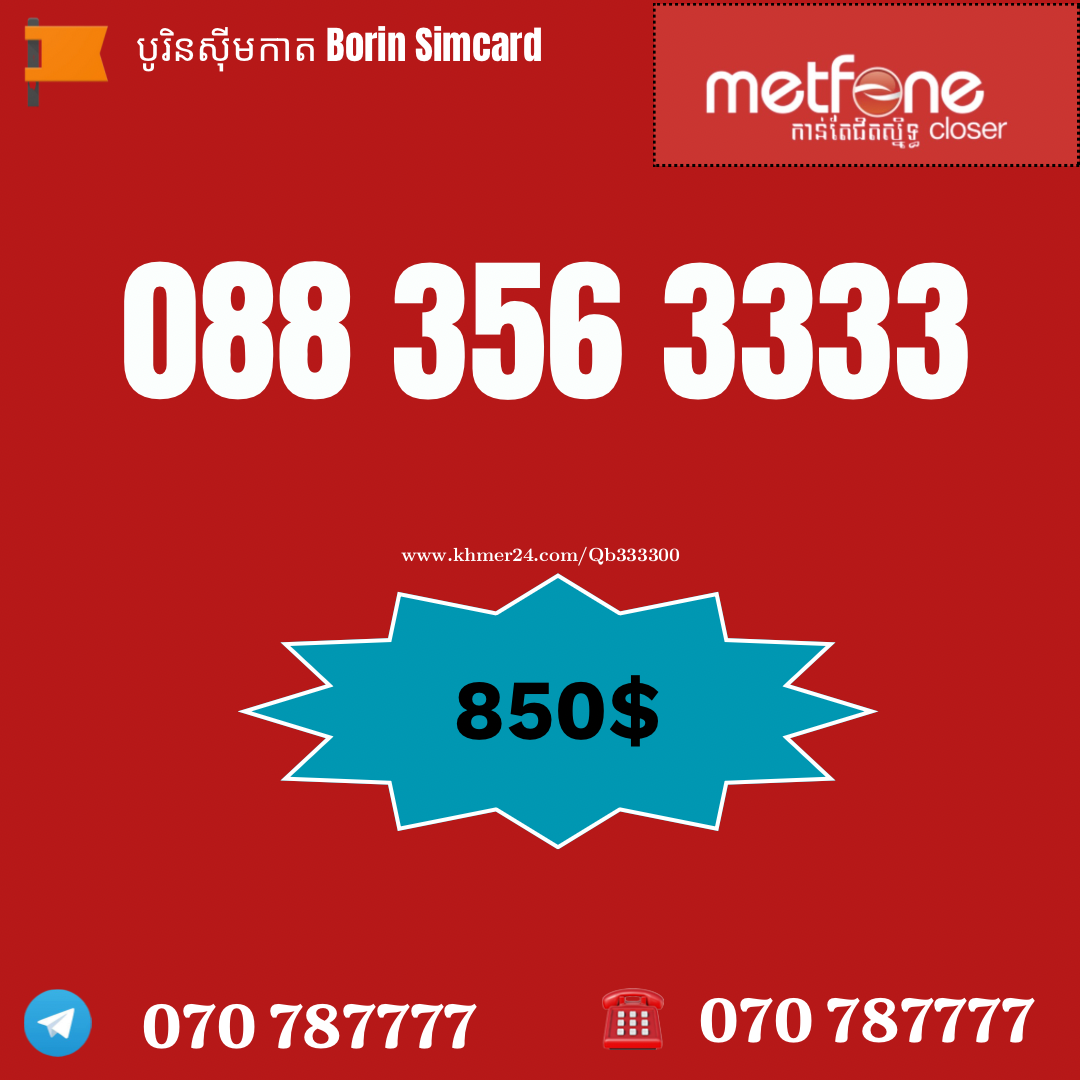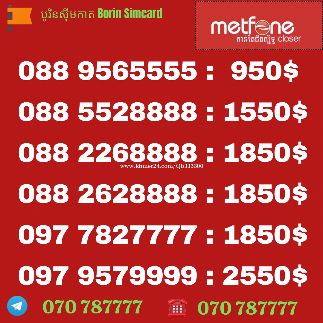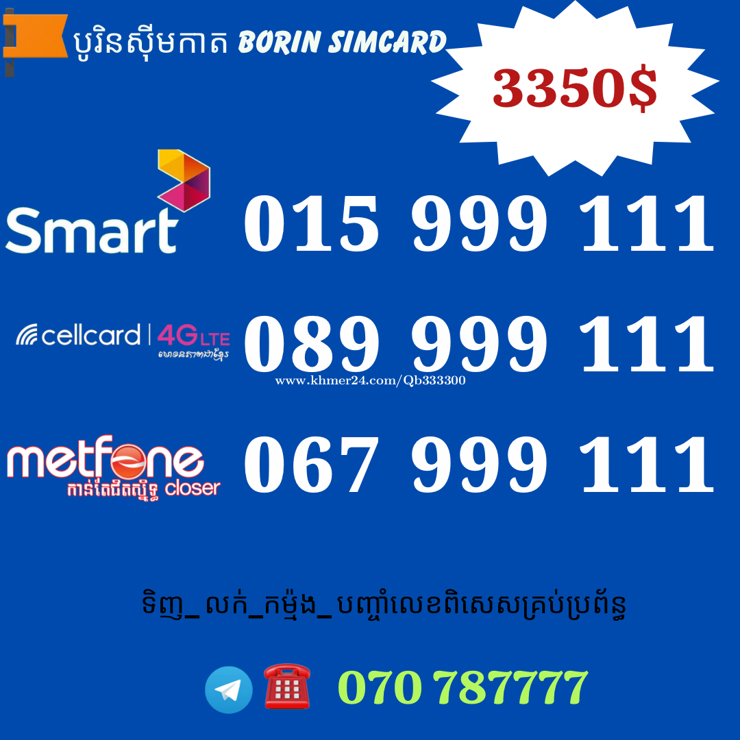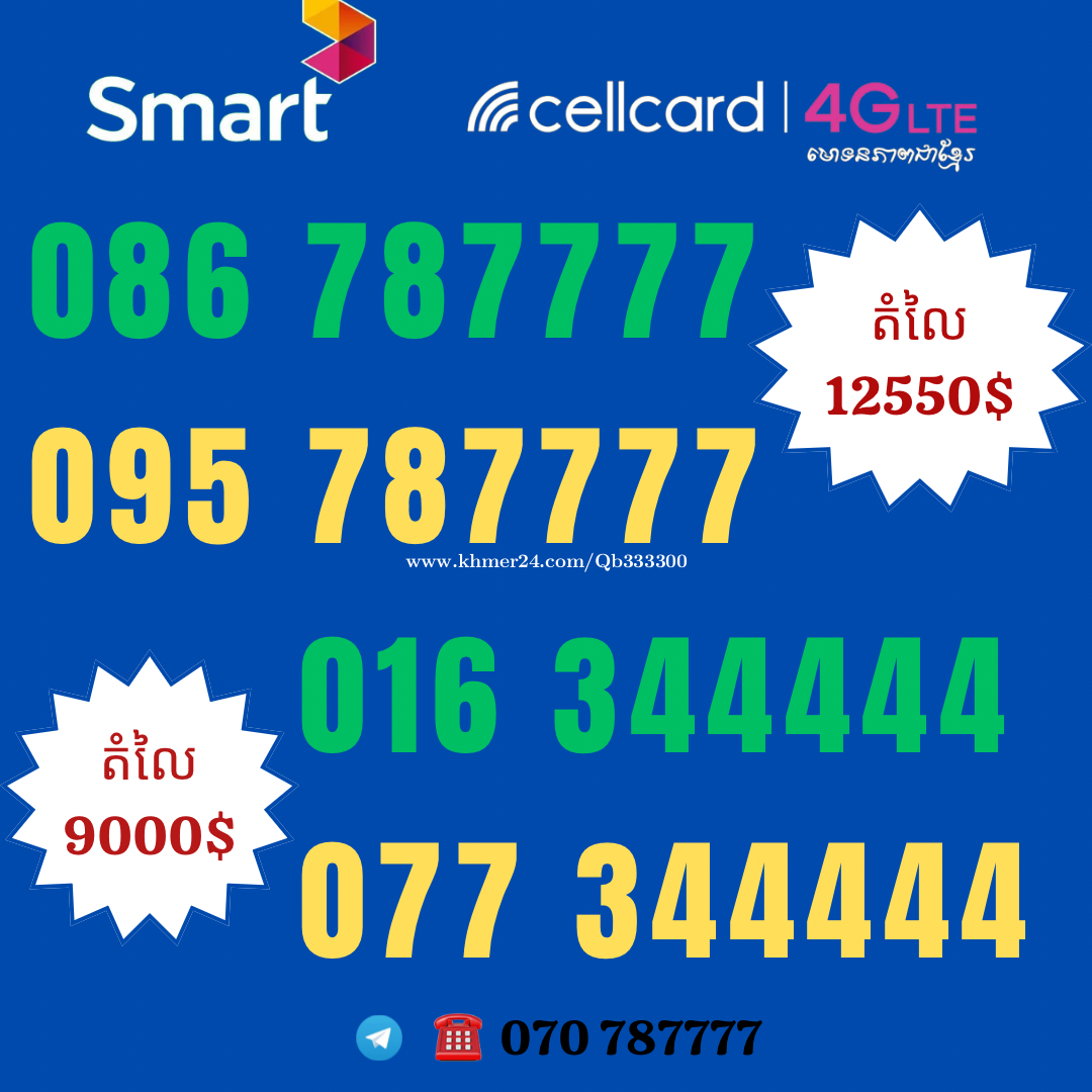 ▶️ មានលក់លេខស្អាតៗគ្រប់ប្រព័ន្ធ និងមានទទួលទិញសុីមលេខពិសេសៗចូលវិញ តំលៃសមរម្យ ធានាមានឈ្មោះនៅក្រុមហ៊ុន 100% ពត៌មានបន្ថែមសូមទំនាក់ទំនង : Telegram : https://t.me/Borin_Ch. & whatApp : 070787777 ☎️ 070 787777 012 666631 = 1850$ - 012 707777 = 15000$ 012 679999 =12500$ - 012 222296 = 2950$ 016 282222 = 3500$ - 081 787878= 4550$ 016 395555 = 1550$ - 016 344444 = $$$$ 015 71 5555 = 1950$ - 015 999111 = 1950$ 016 666695 = 1950$ - 016 686686 = 1550$ 070 999997 = 7500$ - 070 679999 = 2950$ 093 889999 =13500$ - 086 787777 = 7500$ 070 777711 = 2550$ - 070 292222 = 2950$ 010 999966 = 3600$ - 087 999933 = 2950$ 086 999994 = 2850$ - 087 666661 = 2950$ 077 344444 = 4550$ - 086 528888 = 2550$ 011 897777 = 2950$ - 012 759999 = $$$$ 069 865555 = 1600$ - 069 777768 = 1250$ 069 888896 = 1550$ - 015 888852 = 1550$ 086 625555 = 1250$ - 093 727272 = 950$ 015 532222 = 1250$ - 093 333397 = 1250$ 016 333362 = 950$ - 093 382222 = 850$ 069 777706 = 950$ - 069 777795 = 950$ 087 222259 = 550$ - 069 883883 =250$ 087 880088 = 450$ - 086 788778 = 350$ 081 879879 = 250$ - 015 933939 = 168$ 086 657585 = 200$ - 069 888997 = 200$ 093 919696 = 200$ - 016 389898 =180$ 087 698787 = 168$ - 016 911991 = 150$ 015 258787 = 65$ - 016 397788 = 150$ 010 897989 = 150$ - 069 336663 = 150$ 069 808686 = 150$ - 086 818787 = 160$ 069 858787 = 150$ - 087 765567 = 150$ 015 541515 = 150$ - 016 411616 = 150$ 015 938989 = 150$ - 086 779955 = 150$ 010 936789 = 150$ - 086 285285 = 150$ 069 889955 = 150$ - 087 269696 = 120$ 087 908989 = 120$ - 015 257168 = 120$ 070 228282 = 120$ - 081 228855 = 120$ 070 998585 = 120$ - 087 668585 = 120$ 086 778686 = 120$ - 016 917168 = 120$ 086 578686 = 120$ - 087 698787 = 120$ 010 626622 = 120$ - 086 876677 = 120$ 069 929922 = 120$ - 093 929922 = 120$ 087 596555 = 65$ - 069 688989 = 150$ 070 882822 = 65$ - 087 399339 = 65$ 096 2000065 = 65$ - 096 9000058 = 65$ 096 7767677 = 120$ - 096 6600060 = 150$ 096 8600008 = 120$ - 096 6700007 = 150$ 096 8558585 = 150$ - 096 7999925 = 150$ - 096 8020000 = 250$ 096 8688868 = 450$ - 096 8886866 = 350$ 096 5756666 = 750$ - 096 5992222 = 650$ 096 2507777 = 850$ - 096 9549999 = 1250$ 096 6456789 = 2850$ -096 8868888 = 3888$ ***==>Cellcard Number 089 288228 = 65$ - 085 989797 = 65$ 095 297979 = 45$ - 099 756565 = 45$ 095 279797 = 45$ - 095 868685 = 45$ 014 656868 = 120$ - 017 876868 = 120$ 011 233223 = 120$ 017 636767 = 120$ - 095 656767 = 120$ 095 828686 = 120$ - 085 717878 = 120$ 095 919797 = 120$ - 092 700707 = 120$ 077 879696 = 120$ - 089 339696 = 120$ 078 298989 = 150$ - 089 908899 = 150$ 085 200100 = 150$ - 077 600100 = 150$ 017 577878 = 120$ - 017 959797 = 150$ 085 779997 = 168$ - 078 908899 = 168$ 017 565657 = 168$ - 078 776868 = 168$ 099 559898 = 168$ - 077 558787 = 168$ 077 909696 = 200$ - 077 939696 = 200$ 078 966969 = 200$ - 095 555353 = 200$ 095 909595 = 250$ - 089 696966 = 250$ 095 222522 = 350$ - 017 799779 = 350$ 089 500168 = 450$ - 095 234168 = 450$ 077 700600 = 550$ - 077 776776 = 850$ 011 898789 = 450$ - 095 213333 = 550$ 077 700600 = 450$ - 011 700900 = 550$ 085 999289 = 450$ - 085 886688 = 550$ 0123 78999 = 550$ - 017 444465 = 550$ 012 826888 = 850$ - 012 533999 = 750$ 0099 222260 = 450$ - 095 222285 = 550$ 095 333328 = 550$ - 077 555534 = 550$ 089 333319 = 550$ - 095 887887 = 550$ 099 333317 = 500$ - 011 555517 = 650$ 089 984444 = 650$ - 017 824444 = 650$ 077 444400 = 750$ - 012 233323 = 750$ 078 555855 = 850$ - 085 777077 = 750$ 078 372222 = 650$ - 077 626262 = 1950$ 089 777786 = 850$ - 099 666687 = 850$ 011 564444 = 950$ - 077 802222 = 1250$ 077 666685 = 1250$ - 077 345555 = 1950$ 099 888896 = 1250$ - 077 888897 = 1550$ 078 303333 = 1550$ - 099 765555 = 1550$ 089 236666 = 1550$ - 017 285555 = 1550$ 099 888822 = 1850$ - 092 999955 = 1950$ 089 968888 = 2550$ - 078 616666 = 2850$ 077 666333 = 1950$ - 092 333222 = 1950$ 011 848888 = 2950$ - 011 897777 = 2950$ 077 247777 = 2950$ - 095 900900 = 2950$ 012 707777 = 15500$ 089 989989 = 4550$ - 099 666168 = 3850$ 014 777077 = 750$ - 014 888088 = 850$ 014 888008 = 850$ - 014 700800 = 550$ 014 800900 = 950$ - 014 899899 = 1550$ 095 234168 = 500$ - 014 222268 = 450$ 014 333368 = 450$ - 014 444468 = 450$ 014 777786 = 550$ - 014 888826 = 550$ 014 900168 = 450$ - 014 555568 = 650$ 014 888856 = 850$ - 014 555505 = 900$ 014 555515 = 900$ - 014 555522 = 900$ 014 334444 = 950$ - 014 587777 = 1250$ 014 222221 = 1150$ - 014 333331 = 1150$ 014 555551 = 1250$ - 014 555552 = 1250$ 014 666616 = 1200$ - 014 898888 = 3850$ 014 553333 = 1250$ - 014 555553 = 1800$ 014 888848 = 2000$ - 014 888858 = 2000$ 014 888855 = 2000$ - 014 888838 = 2550$ 076 9789789 = 450$ - 076 8789789 = 450$ 076 2242222 = 650$ - 076 6565665 = 150$ 076 3445678 = 250$ 076 7898999 = 350$ - 076 2345168 = 450$ 076 9999924 = 750$ - 076 9999991 = $$$$ ***Metfone Numbers 066 838888 = 4500$ - 066 797777 = 4550$ 088 3563333 = 850$ - 031 8563333 =350$ 088 9565555 = 950$ - 088 2628888 = 1850$ 097 7827777 = 1850$ - 088 2268888 = 1850$ 088 5528888 = 1550$ - 097 9579999 = 2550$ Smart - Cellcard - Metfone 📶 015 999111 📶 089 999111 }3300$ 📶 067 999111 …………………………………… 📶 098 717878 📶 085 717878 : 200$ ………………………………………. 📶 069 959797 📶 098 678997 📶 095 959797 180$ 📶 077 678997 } 200$ Tel: 070 787777