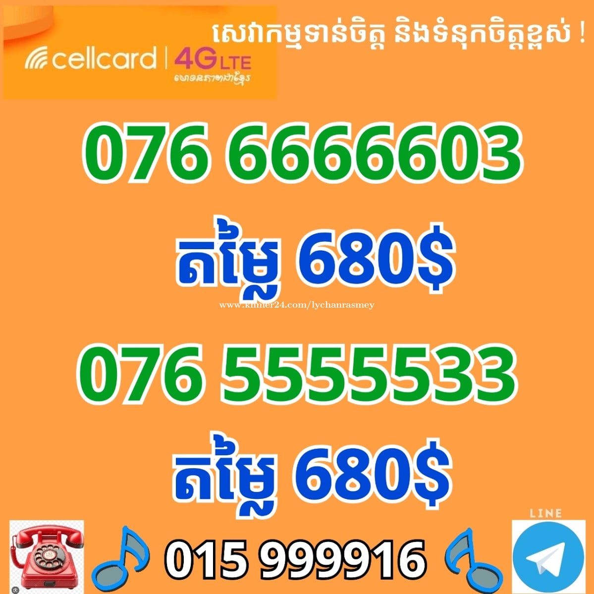 Cellcard 076 5656560 =55$ - 076 6767675 =55$ 076 8787876 =55$ 076 5555256 =150$ -076 2252525 =150$ 076 2222275 =350$ -076 2222256 =350$ 076 3333316 =650$ -076 4444464 =650$ 076 9999953 =650$ -076 9999982 =650$ 076 6666603 =850$ -076 5555533 =850$ 076 8888836 =1000$ 076 5555595 =2000$ 076 9797777 =2000$ 076 9999955 =2000$ 076 8888838 =2500$ 076 9999919 =2500$ 076 4444443 =2000$ 076 4444445 =2500$ 076 7979999 =2500$ 076 9889999 =6800$ 076 2898888 =6800$ 076 7777772 =6800$ 076 8888885 =6800$ 076 9999992 =6800$ 076 8999988 =2000$ Metfone 068 999971 =850$ 068 999991 =3500$ 060 678888 =3500$ 031 2225555 =2000$ 071 7777797 =2200$ 088 6666692.=850$ 031 3333315 =$$$$