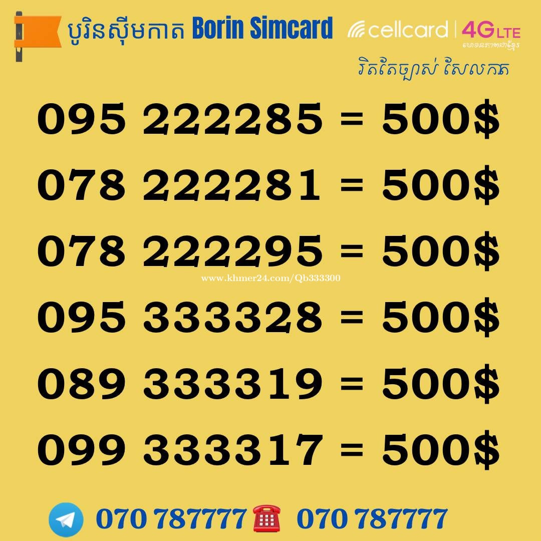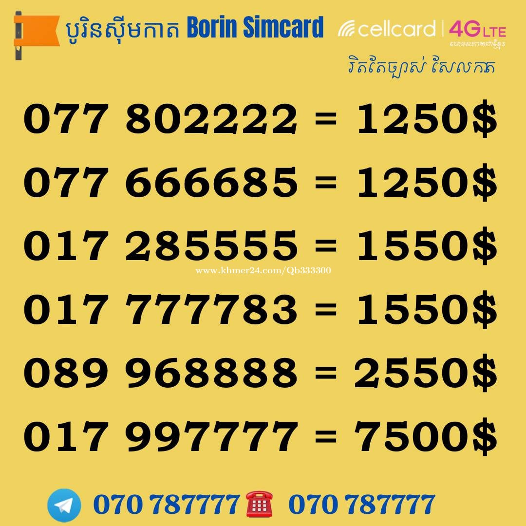 ▶️ មានលក់លេខស្អាតៗគ្រប់ប្រព័ន្ធ និងមានទទួលទិញសុីមលេខពិសេសៗចូលវិញ តំលៃសមរម្យ ធានាមានឈ្មោះនៅក្រុមហ៊ុន 100% ពត៌មានបន្ថែមសូមទំនាក់ទំនង : Telegram : https://t.me/Borin_Ch. & whatApp : 070787777 ☎️ 070 787777 012 666631 = 1950$ - 012 707777 = 15000$ 016 282222 = 3500$ - 081 787878= 4550$ 016 395555 = 1550$ - 016 344444 = $$$$ 015 71 5555 = 1950$ - 015 999111 = 1950$ 016 666695 = 1950$ - 016 686686 = 1550$ 070 999997 = 7500$ - 070 679999 = 2950$ 093 889999 =15500$ - 086 787777 = 7500$ 070 777711 = 2550$ - 070 292222 = 2950$ 010 999966 = 3600$ - 087 999933 = 2950$ 086 999994 = 2850$ - 087 666661 = 2950$ 077 344444 = 4550$ - 086 528888 = 2550$ 011 897777 = 2950$ - 012 759999 = $$$$ 069 865555 = 1600$ - 069 777768 = 1250$ 069 888896 = 1550$ - 015 888852 = 1550$ 086 625555 = 1250$ - 070 827777 = 1850$ 015 532222 = 1250$ - 093 333397 = 1250$ 016 333362 = 950$ - 086 873333 = 850$ 069 777706 = 950$ - 069 777795 = 950$ 087 222259 = 550$ - 069 883883 =250$ 087 880088 = 450$ - 086 788778 = 350$ 081 879879 = 250$ - 015 933939 = 168$ 086 657585 = 200$ - 069 888997 = 200$ 093 919696 = 200$ - 016 389898 =180$ 016 289889 = 168$ - 070 277272 = 168$ 087 698787 = 168$ - 016 911991 = 150$ 015 226262 = 150$ - 069 883833 = 120$ 010 897989 = 150$ - 069 336663 = 150$ 069 808686 = 150$ - 086 818787 = 160$ 069 858787 = 150$ - 087 765567 = 150$ 015 541515 = 150$ - 016 411616 = 150$ 015 938989 = 150$ - 086 779955 = 150$ 010 936789 = 150$ - 086 285285 = 150$ 069 889955 = 150$ - 087 269696 = 120$ 087 908989 = 120$ - 010 257168 = 120$ 070 228282 = 120$ - 081 228855 = 120$ 070 998585 = 120$ - 087 668585 = 120$ 086 778686 = 120$ - 016 969977 = 120$ 010 285 168 = 120$ - 016 917168 = 120$ 086 578686 = 120$ - 087 698787 = 120$ 010 626622 = 120$ - 086 876677 = 120$ 069 929922 = 85$ - 093 929922 = 85$ 087 596555 = 65$ - 069 688989 = 150$ 070 882822 = 65$ - 087 399339 = 65$ 096 2000065 = 65$ - 096 9000058 = 65$ 096 7767677 = 120$ - 096 6600060 = 150$ 096 8600008 = 120$ - 096 6700007 = 150$ 096 8558585 = 150$ - 096 7999925 = 150$ - 096 8020000 = 250$ 096 8688868 = 450$ - 096 8886866 = 350$ 096 5756666 = 750$ - 096 5992222 = 650$ 096 2507777 = 950$ - 096 9549999 = 1250$ 096 6456789 = 2850$ -096 8868888 = 3888$ 096 7777770 = 4550$ ***==>Cellcard Number 089 288228 = 65$ - 085 989797 = 65$ 095 297979 = 65$ - 099 756565 = 65$ 095 279797 = 65$ - 095 868685 = 65$ 014 656868 = 120$ - 017 876868 = 120$ 011 233223 = 120$ 017 636767 = 120$ - 095 656767 = 120$ 095 828686 = 120$ - 085 717878 = 120$ 095 919797 = 120$ - 092 700707 = 120$ 077 879696 = 120$ - 089 339696 = 120$ 017 959797 = 150$ 078 298989 = 150$ - 089 908899 = 150$ 085 200100 = 150$ - 077 600100 = 150$ 017 577878 = 120$ - 077 558787 = 168$ 085 779997 = 168$ - 078 908899 = 168$ 017 565657 = 168$ - 078 776868 = 168$ 099 559898 = 168$ - 017 578787 = 168$ 077 909696 = 200$ - 077 939696 = 200$ 078 966969 = 200$ - 095 555353 = 200$ 095 909595 = 250$ - 089 696966 = 250$ 095 222522 = 350$ - 017 799779 = 350$ 089 500168 = 450$ - 095 234168 = 450$ 077 700600 = 550$ - 077 776776 = 850$ 011 898789 = 450$ - 095 213333 = 550$ 077 700600 = 450$ - 011 700900 = 550$ 085 999289 = 450$ - 085 886688 = 550$ 0123 78999 = 550$ - 017 444465 = 550$ 012 826888 = 850$ - 012 533999 = 850$ 078 222281 = 500$ - 099 222260 = 450$ 095 222285 = 550$ - 078 222295 = 550$ 095 333328 = 550$ - 077 555534 = 550$ 089 333319 = 550$ - 095 887887 = 550$ 078 333381 = 550$ - 099 333317 = 500$ 011 555517 = 650$ - 089 984444 = 650$ - 017 824444 = 650$ 077 444400 = 750$ - 012 788778 = 950$ 078 555855 = 850$ - 085 777077 = 750$ 078 372222 = 750$ - 077 626262 = 1950$ 089 777786 = 850$ - 099 666687 = 850$ 011 564444 = 950$ - 077 802222 = 1250$ 077 666685 = 1250$ - 077 345555 = 1950$ 099 888896 = 1250$ - 077 888897 = 1550$ 078 303333 = 1550$ - 099 765555 = 1550$ 089 236666 = 1550$ - 017 285555 = 1550$ 099 888822 = 1850$ - 092 999955 = 1950$ 089 968888 = 2550$ - 078 616666 = 2850$ 077 666333 = 2550$ - 092 333222 = 1950$ 011 848888 =3550$ - 011 897777 = 2950$ 077 247777 = 2950$ - 095 900900 = 2950$ 012 707777 = 15500$ 089 989989 = 4550$ - 099 666168 = 3850$ 014 777077 = 750$ - 014 888088 = 850$ 014 888008 = 850$ - 014 700800 = 550$ 014 800900 = 950$ - 014 899899 = 1550$ 095 234168 = 500$ - 014 222268 = 450$ 014 333368 = 450$ - 014 444468 = 450$ 014 777786 = 550$ - 014 888826 = 550$ 014 900168 = 450$ - 014 555568 = 650$ 014 888856 = 850$ - 014 555505 = 900$ 014 555515 = 900$ - 014 555522 = 900$ 014 334444 = 950$ - 014 587777 = 1250$ 014 222221 = 1150$ - 014 333331 = 1150$ 014 555551 = 1250$ - 014 555552 = 1250$ 014 666616 = 1200$ - 014 898888 = 3850$ 014 553333 = 1250$ - 014 555553 = 1800$ 014 888848 = 2000$ - 014 888858 = 2000$ 014 888855 = 2000$ - 014 888838 = 2550$ 076 9789789 = 450$ - 076 8789789 = 450$ 076 2242222 = 650$ - 076 6565665 = 150$ 076 3445678 = 250$ - 076 8668868 = 150$ 076 7898999 = 350$ - 076 2345168 = 450$ 076 9999924 = 750$ - 076 9999991 = $$$$ ***Metfone Numbers 060 338333 = 350$ 066 838888 = 4500$ - 066 797777 = 4550$ 088 3563333 = 850$ - 031 8563333 =350$ 088 9565555 = 950$ - 088 2628888 = 1850$ 097 7827777 = 1850$ - 088 2268888 = 1850$ 088 5528888 = 1550$ - 097 9579999 = 2550$ Smart - Cellcard - Metfone 📶 015 999111 📶 089 999111 }3300$ 📶 067 999111 …………………………………… 📶 098 717878 📶 085 717878 : 200$ ………………………………………. 📶 069 959797 📶 098 678997 📶 095 959797 180$ 📶 077 678997 } 200$ Tel: 070 787777