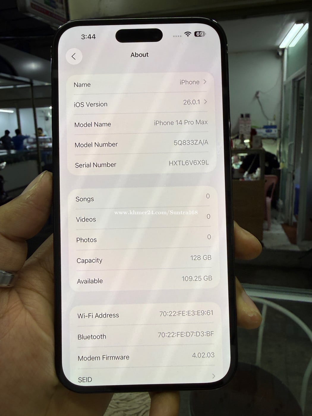 Iphone 14ProMax 128G Zaសុីម2 ស្អាត98.5% https://t.me/suntraphone 👉Iphone11 _ គូទសាក = 10$ _ កាមេរ៉ាមុខ = 5$ _ កាមេរ៉ាក្រោយ = 15$ _ ថ្ម =13$ 👉Iphone11P _ កាមេរ៉ាមុខ = 5$ _ គូទសាក = 25$ _ Senser = 5$ _ Speaker = 3$ _ Flash = 3$ _ ដុំញ័រ = 3$ _ ថ្ម = 13$ 👉Iphone 11PM _ គូទសាក = 25$ _ កាមេរ៉ាមុខ = 5$ _ កាមេរ៉ាក្រោយ = ❌ _ ថ្ម = 18$ 👉Iphone 12 _ គូទសាក =12.5$ _ កាមេរ៉ាមុខ = 5$ _ កាមេរ៉ាក្រោយ = 20$ _ ថ្ម = 13$ 👉Iphone 12 mini _ គូទសាក =12.5$ _ កាមេរ៉ាមុខ = 5$ _ ថ្ម = 13$ 👉Iphone 12P _ គូទសាក = 12.5$ _ កាមេរ៉ាមុខ = 5$ _ កាមេរ៉ាក្រោយ = ❌ _ ថ្ម = 13$ 👉Iphone 12PM _ គូទសាក = 20$ _ កាមេរ៉ាមុខ = 5$ _ កាមេរ៉ាក្រោយ = 45$ _ Speaker = 8$ _ ថ្ម = 18$ 👉Iphone 13 _ គូទសាក = 12.5$ _ កាមេរ៉ាមុខ = 5$ _ កាមេរ៉ាក្រោយ = 20$ _ ថ្ម = 13$ 👉Iphone 13Mini _ ថ្ម = 12.5$ _ គូតសាក = 15$ _ កាមេរ៉ាមុខ = 5$ 👉Iphone 13Pro _ថ្ម = 18$ _គូតសាក = 20$ _កាមេរ៉ាមុខ =5$ 👉Iphone 13PM _ គូទសាក = 20$ _ កាមេរ៉ាមុខ = 5$ _ កាមេរ៉ាក្រោយ = ❌ _ Senser = 5$ _ Speaker = 5$ _ ដុំញ័រ = 3$ _ ថ្ម = 20$ 👉Iphone 14PM _ គូទសាក = 20$ _ កាមេរ៉ាមុខ = 8$ _ កាមេរ៉ាក្រោយ = 45$ _ ថ្ម = 20$ 👉Iphone 14 _ ថ្ម = 15$ 👉Iphone 14Pro _ ថ្ម = 18$ _គូតសាក = 20$ Updated 30 - 01 - 26🙏😍