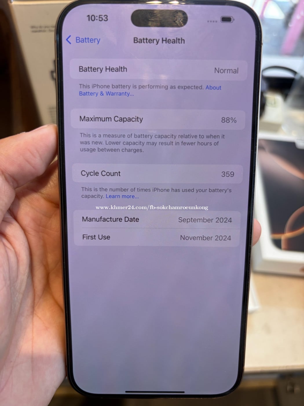 Iphone 16 pro max / 256GB / XA ប្រើផ្ទាល់។ មានប្រអប់ Full set free ឆ្នាំងសាក ហ្សីន ។ case original magsafe.