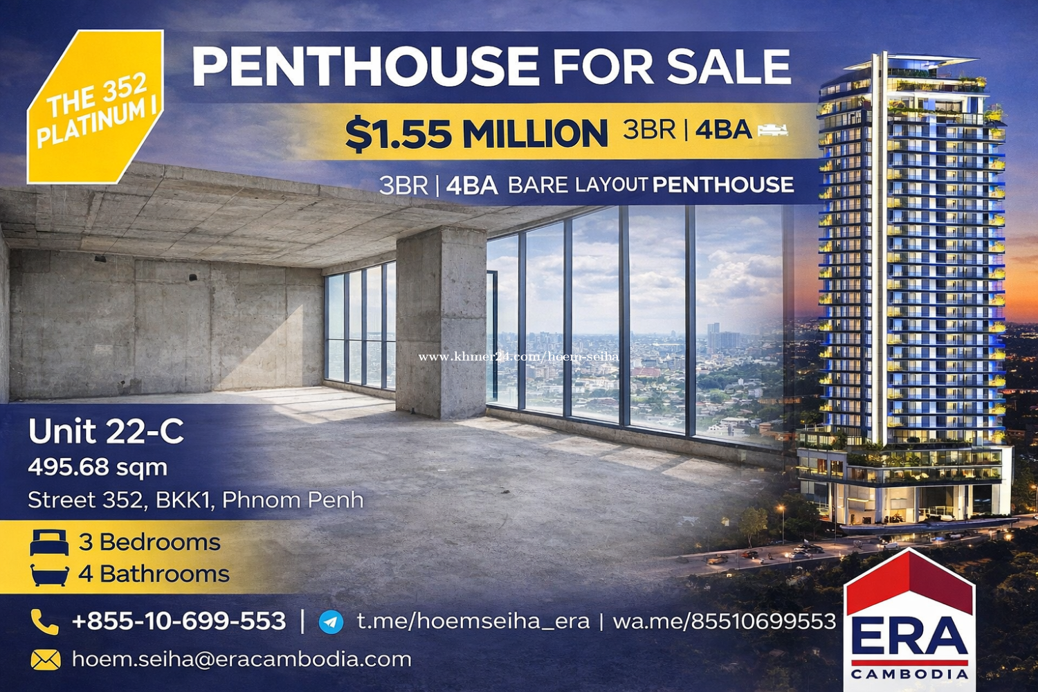Penthouse [3BR 4Ba Layout] of ~500 SQM with Private Sky Pool – The 352 Platinum I, BKK1, Phnom Penh Location: Street 352, Boeung Keng Kang 1 (BKK1), Phnom Penh Project: The 352 Platinum I Unit: 22-C (Sky Pool Villa / Penthouse) Floor: 22nd Floor Unit Details • Private Area: 355.74 sqm • Total Area (incl. common): 495.68 sqm • Layout: 3 Bedrooms | 4 Bathrooms • Double-height living room (7.2m ceiling) • Large balcony + sky pool concept • Strata Title (Hard Title) • Foreign ownership eligible Asking Price: USD1,550,000 (Nego, resale 13% below bought price) Highlights ✓ True penthouse living in BKK1 ✓ Private sky pool concept ✓ Only 2 penthouses in the entire building ✓ Luxury facilities: Sky bar, gym, infinity pool, club lounge ✓ Prime embassy-zone location Serious buyers only – Private viewing by appointment. 📞 +8551069xxxClick To Call3 💬 Telegram: t.me/hoemseiha_era 💬 WhatsApp: wa.me/85510699553 📧 hoe*******@eracambodia.comClick To Sent Email
