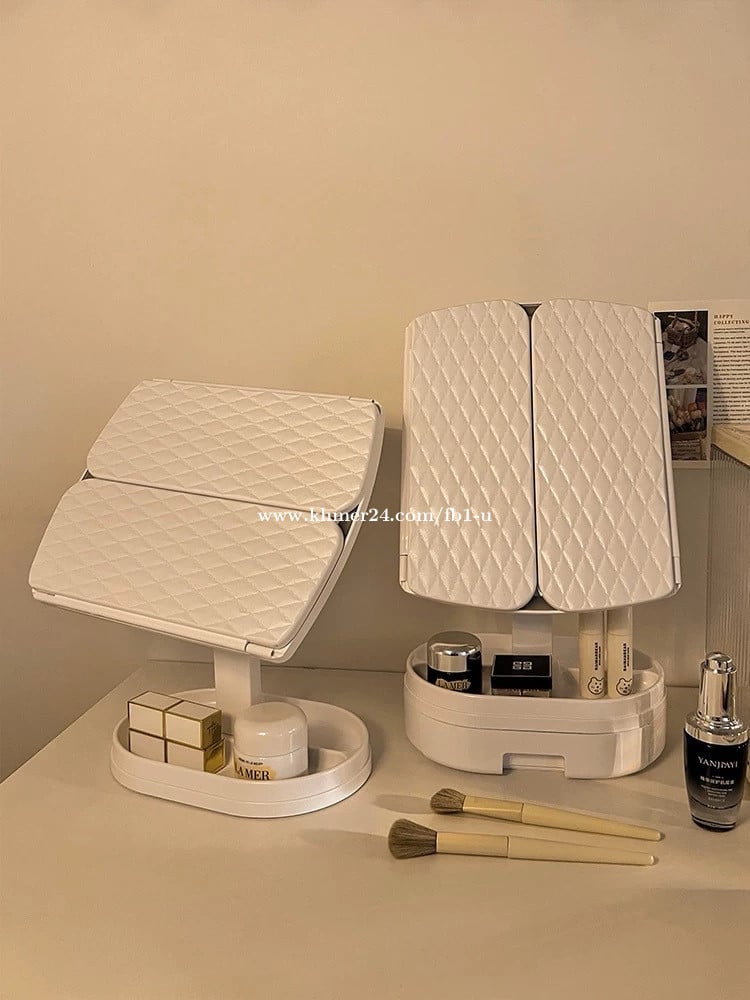 កញ្ចក់មើលមុខសម្រាប់តុតុបតែង មានភ្លើង LED អាចសាកថ្មបាន រចនាបែបប្រណិត និងមានប្រយោជន៍ សម្រាប់ស្ត្រី អាចបត់បាន 270° រចនាប័ទ្មបីស្រទាប់ (Tri-Fold) ងាយស្រួលដាក់ក្នុងកាបូបស្ពាយ និងយកតាមខ្លួនបាន LED Lighted Makeup Mirror, Desktop Vanity Mirror, Rechargeable, Elegant & Practical for Girls 270° Adjustable, Tri-Fold Design, Portable and Easy to Carry in a Backpack