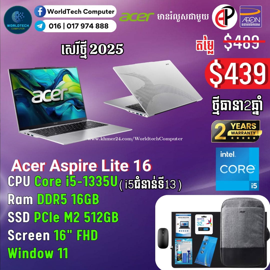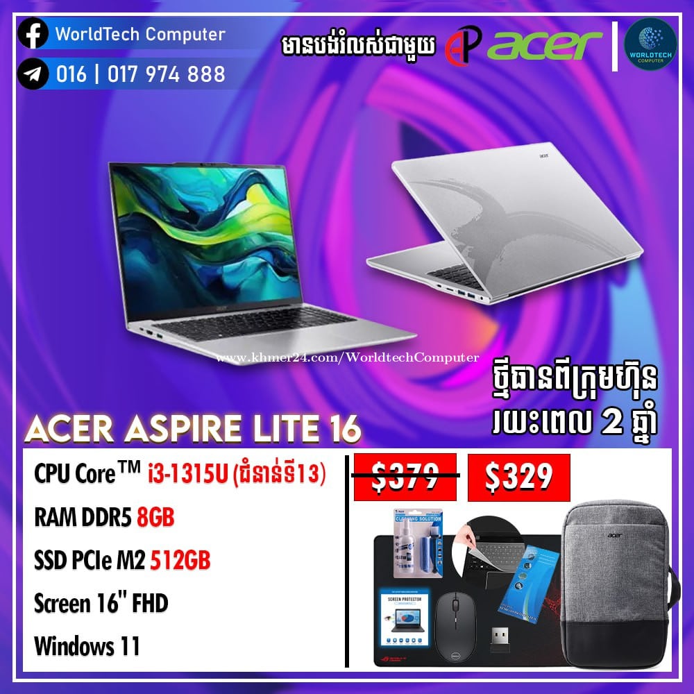 Acer Aspire lite16 Core i3-1315U RAM 8G M2 512G 16" New2025=325$ Acer Aspire lite16 Core i3-1315U RAM 16G M2 512G 16" New2025=359$ Acer Aspire lite16 Core i5-1335U RAM 16G M2 512G 16" New2025=429$ ថ្មីកេស ធានា២ឆ្នាំ Telegram: 017974xxxClick To Call , 011777xxxClick To Call