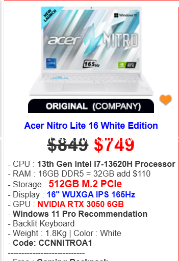 Acer Nitro Lite 16 White Edition - CPU : 13th Gen Intel i7-13620H Processor - RAM : 16GB DDR5 = 32GB add $110 - Storage : 512GB M.2 PCIe - Display : 16" WUXGA IPS 165Hz - GPU : NVIDIA RTX 3050 6GB - Windows 11 Pro Recommendation - Backlit Keyboard - Weight : 1.8Kg | Color : White - Code: CCNNITROA1
