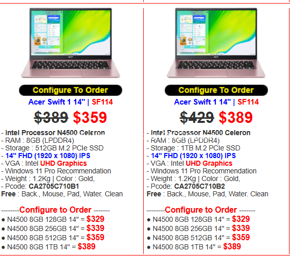 Acer Swift 1 14" | SF114 $329 - Intel Processor N4500 Celeron - RAM : 8GB (LPDDR4) - Storage : 512GB M.2 PCIe SSD - 14" FHD (1920 x 1080) IPS - VGA : Intel UHD Graphics - Windows 11 Pro Recommendation - Weight : 1.2Kg | Color : Gold, - Pcode: CA2705C710B1 ☎️ ទនាក់ទំនង 0930957xxxClick To Call 77 💬 Telegram : t.me/cnkcomputer93 🌐 Website: https://cnkcomputer.com/