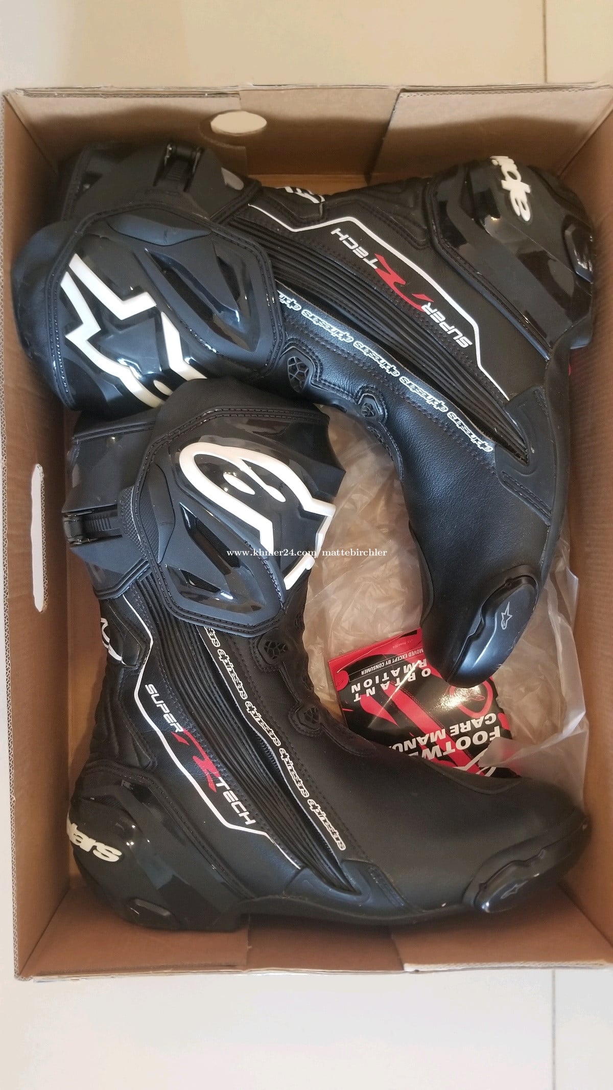 Brand new Size 45 Almost every component of the Supertech R Vented Boot, Alpinestars definitive racing boot as worn by a roster of champions past and present, has undergone a rigorous program of upgrades to sharpen its performance features even further. Featuring extensive perforations throughout for maximum airflow, innovations derived using feedback from Alpinestars involvement in top flight racing include a newly redesigned front flex area, a redesigned rear bellow, a redesigned top gaitor, a new shifter and shin plate, a new shin slider and a new inner bootie, all of which enhance the comfort, protection and the performance of this boot to a new class-leading high.