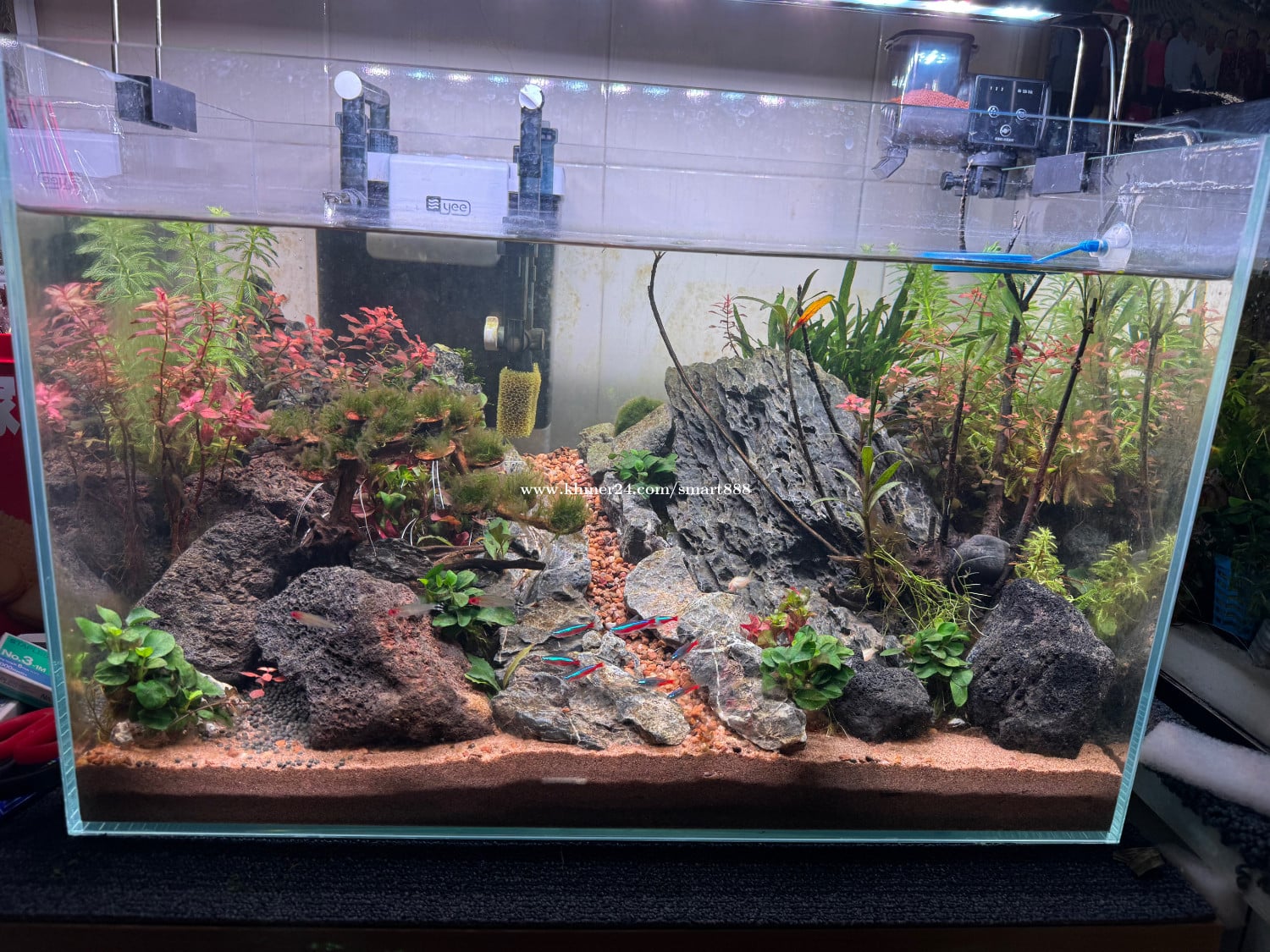 Aquarium tank aquscape real plants 60x35x40 all are include: - Fish tank and design - Pump and lamp can set up automatic time on and off - Automatic feeder - Fish and shrimp