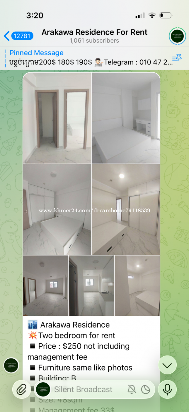 ๐๏ธ Arakawa Residence ๐ฅTwo bedroom for rent โช๏ธPrice : $250 not including management fee โช๏ธFurniture same like photos โช๏ธBuilding: B โช๏ธFloor : 9 โช๏ธSize: 48sqm โช๏ธManagement fee 33$ ๐ฆ Water : 0,7$ โก๏ธ EDC : 0,25$ ๐ ฟ๏ธ Parking : 3$ for Motor/ 44$ for Car Facility: Aeon Max Valu , Gym , Playground , cafe shop , โฆ Tel: 010472xxxClick To Call Telegram: https://t.me/Vatey_SalesConsultant More property: https://t.me/Arakawaresaleandrental