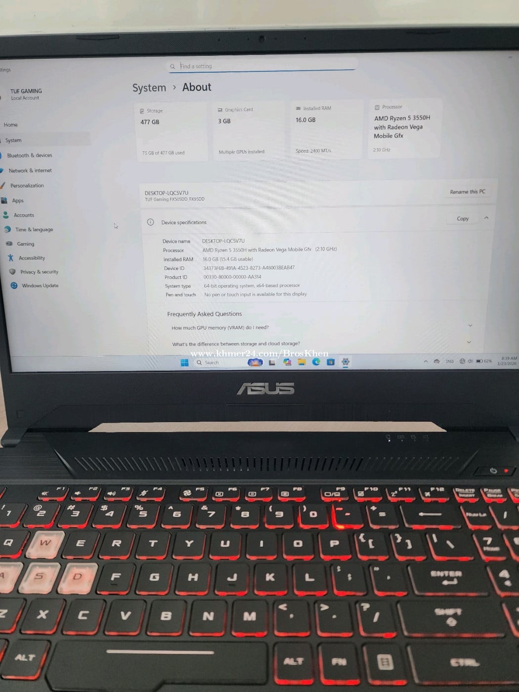Gaming បងៗSpac ល្អតម្លៃធូរថ្លៃ - Asus TUF Gaming FX95DD - CPU AMD Ryzen5 3550H - RAM 16GB DDR4 - Storage SSD SATA 512GB - VAG Nvidia GeForce GTX 1050 3GB - Screen size 16 inch - Keyboard មានភ្លើង - ឆ្នាំងសាក ហ្ស៊ីន - មានថែម ជូនម៉ៅ ទ្រនាប់ម៉ៅ នឹងកាតាមជូន - ធានារយៈពេល 2ខែជូន 📩 ខល ឬ តេលេក្រាម 087597xxxClick To Call,0972655xxxClick To Call