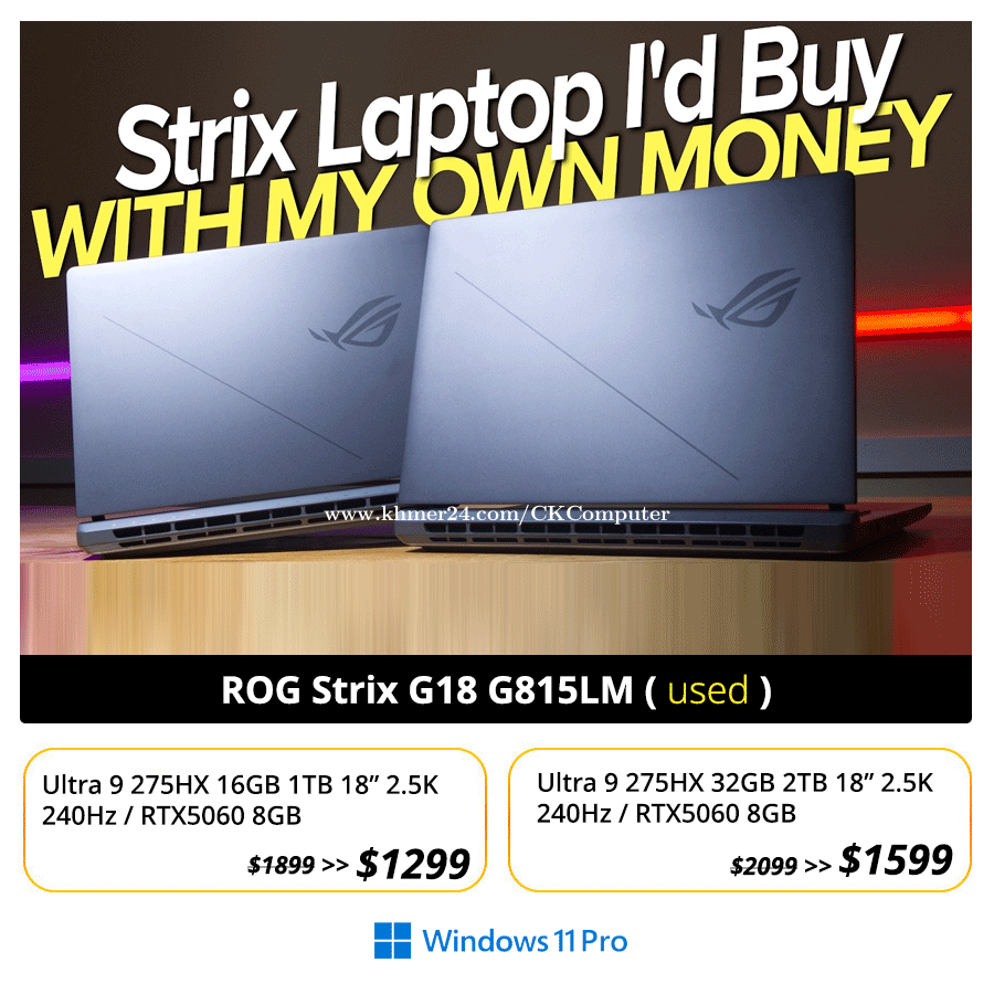 ASUS ROG Strix G18 | G815LM Price : 1799$ >> $1299 (used) ----------------------------------------- - Intel Core Ultra 9 275HX Processor - RAM : 16GB (DDR5) - Storage : 1TB M.2 PCIe 4.0 - 18-inch 2.5K 240Hz DCI-P3:100.00% - VGA 1 : IntelAI Boost NPU Upto 13TOPS - VGA 2 : NVIDIA RTX 5060 8GB - OS : Windows 11 License - 3.0Kg | 90WHrs, 4S1P, 4-cell Li-ion - Backlit Chiclet Keyboard Per-Key RGB - Color : Volt Green ------------------------------------- ☎️ ទនាក់ទំនង 0950937xxxClick To Call 77 💬 Telegram : t.me/cnkcomputer93 🌐 Website: https://cnkcomputer.com/