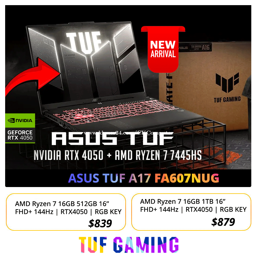 ASUS TUF A16 FA607NUG : $979 >> $879 -------------------------------------- - AMD Ryzen 7 7445H processor - RAM : 16GB (DDR5) = 32GB = $100 - Storage : 1TB M.2 PCIe SSD - 16" 1920 x 1200, WUXGA 144Hz IPS - GPU/VGA : NVIDIA RTX4050 6GB - Windows 11 License | RGB 1 Zone - Weight : 2.0Kg | Color : Mecha Gray ---------------------------- ☎️ ទនាក់ទំនង 0930957xxxClick To Call 77 💬 Telegram : t.me/cnkcomputer93 🌐 Website: https://cnkcomputer.com/