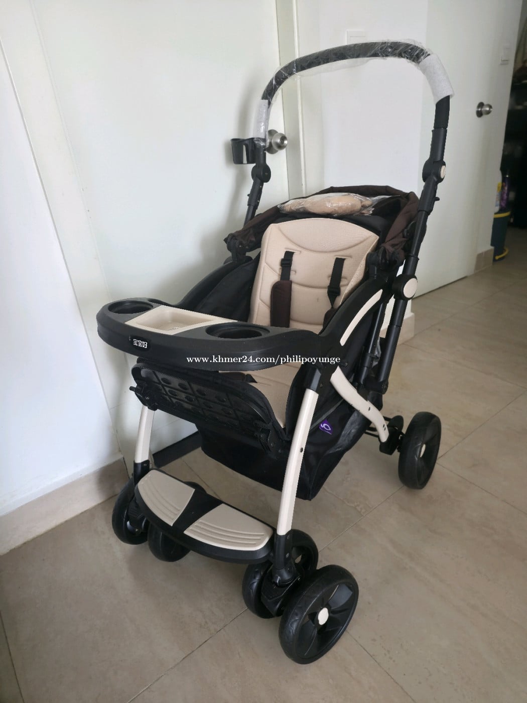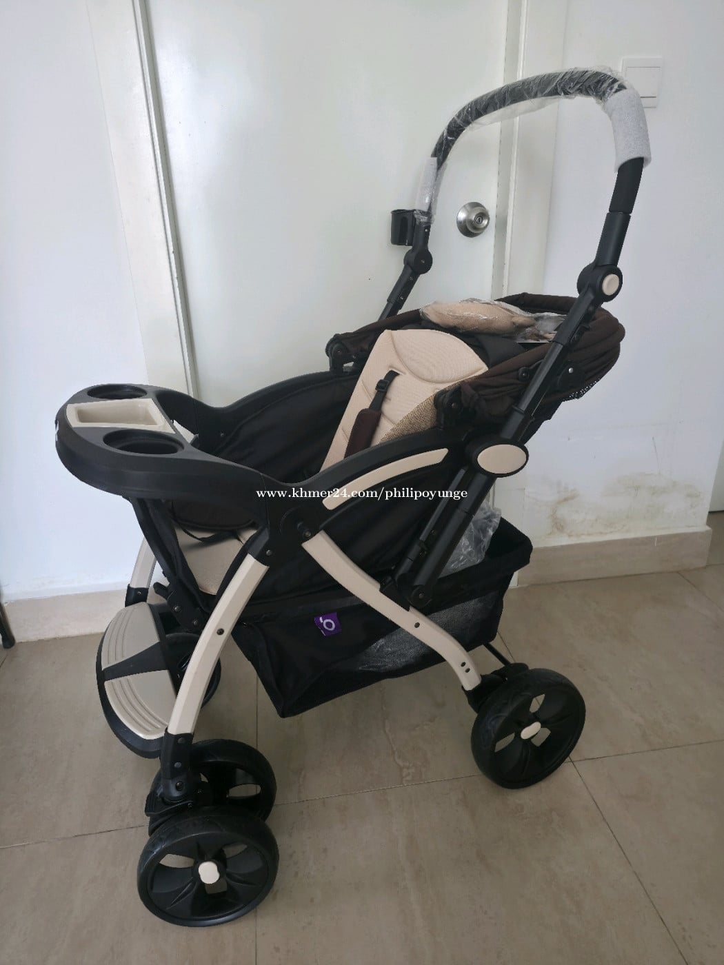 Features rubber wheels with shock absorbers and a large storage bag. The seat position is adjustable for sitting or lying down.