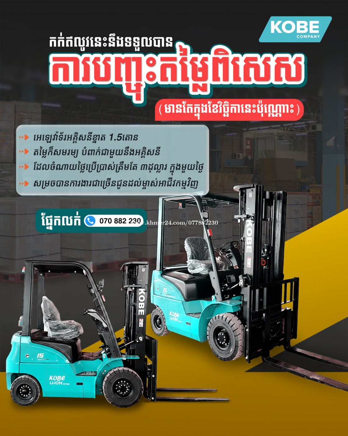 ចំណាយត្រឹម3$ក្នុងការសាកថ្ម ប្រើបានមួយថ្ងៃ ជាមួយនិងអេឡេវ៉ាទ័រកូបេ អគ្គិសនីអាគុយស្ងួត៕ === ព័ត៌មានបន្ថែម៖ ☎ ផ្នែកលក់៖ 070882xxxClick To Call 👉 តេលេក្រាម https://t.me/Kobeforklift30 👉Chanel សម្រាប់ការបញ្ចុះតម្លៃផ្សេងៗ https://t.me/Kobe_Forklift