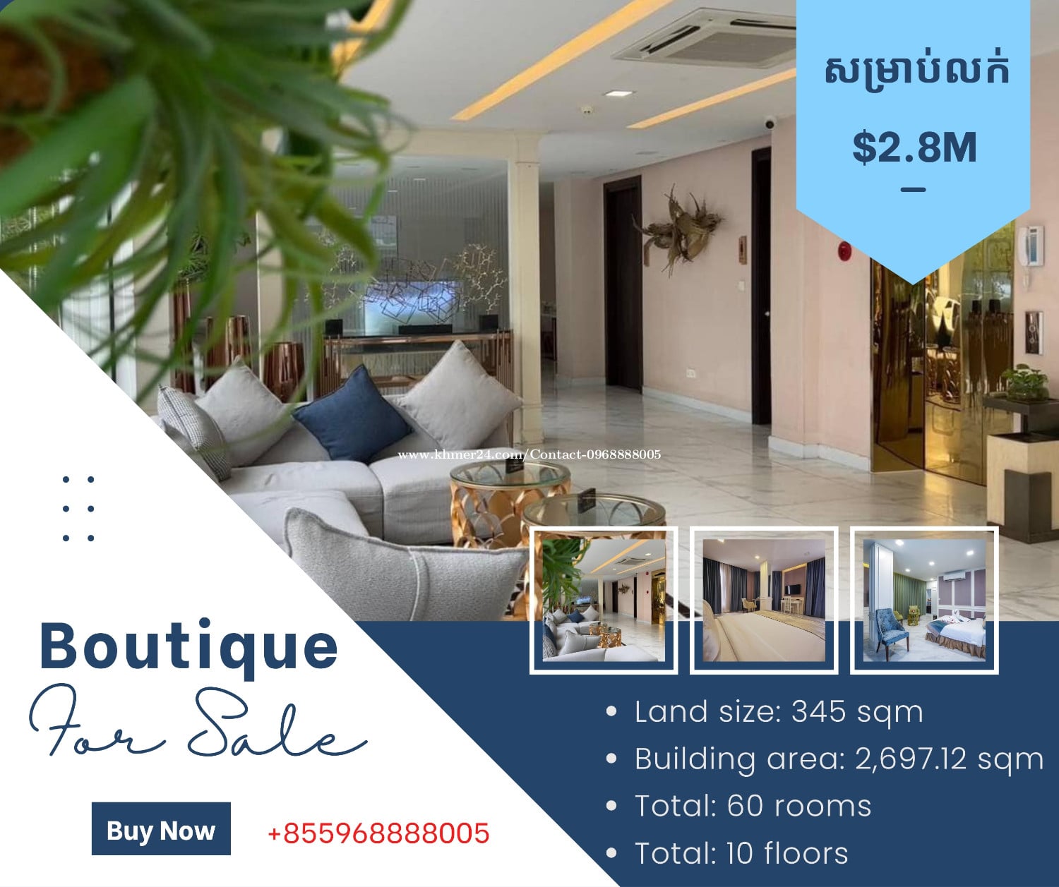 Boutique for Sale Under Market Price in BKK, Phnom Penh - Under operating, generating monthly income - Land size: 345 sqm - Building area: 2,697.12 sqm - Total: 60 rooms - Total: 10 floors - Including all equipment & furniture Price NOW: $2,800,000 (Negotiable) ๐ Contact / แแแแถแแแแแแ: +8559688888005 Click Here Telegram: https://t.me/Brother0968888005
