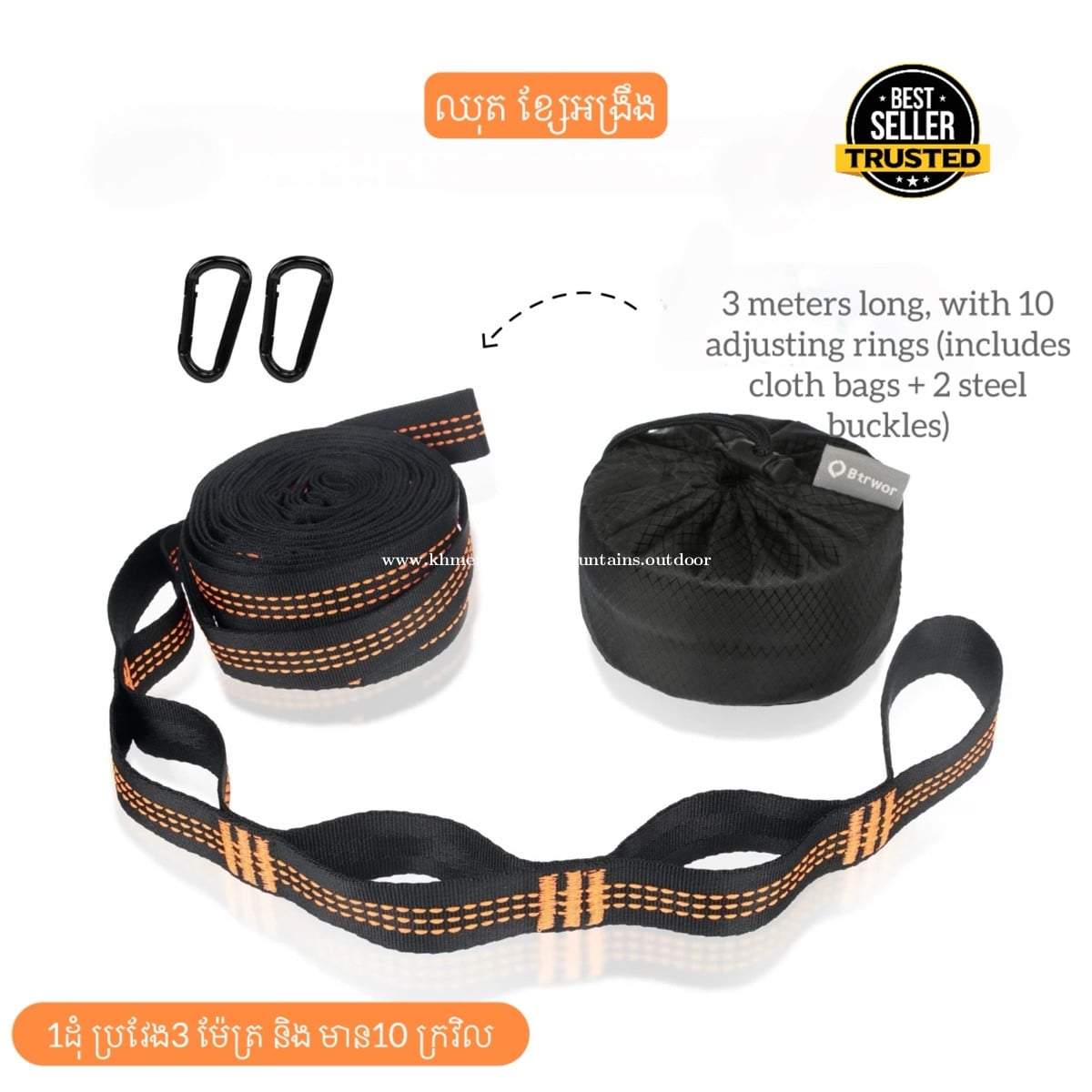 Coming soon Hammock Strap Features: • Length: 3 meters • 10 adjustment loops for easy height setup • Includes cloth carry bag • Comes with 2 steel buckles • Strong and durable woven strap • Suitable for hammocks, swings, and outdoor setups ————————————————————— *Contact:0966381xxxClick To Call/https://t.me/mountains_outdoor *Address:Borey Sorlar, 7A Street 371, Phnom Penh