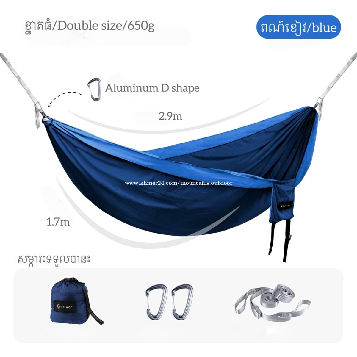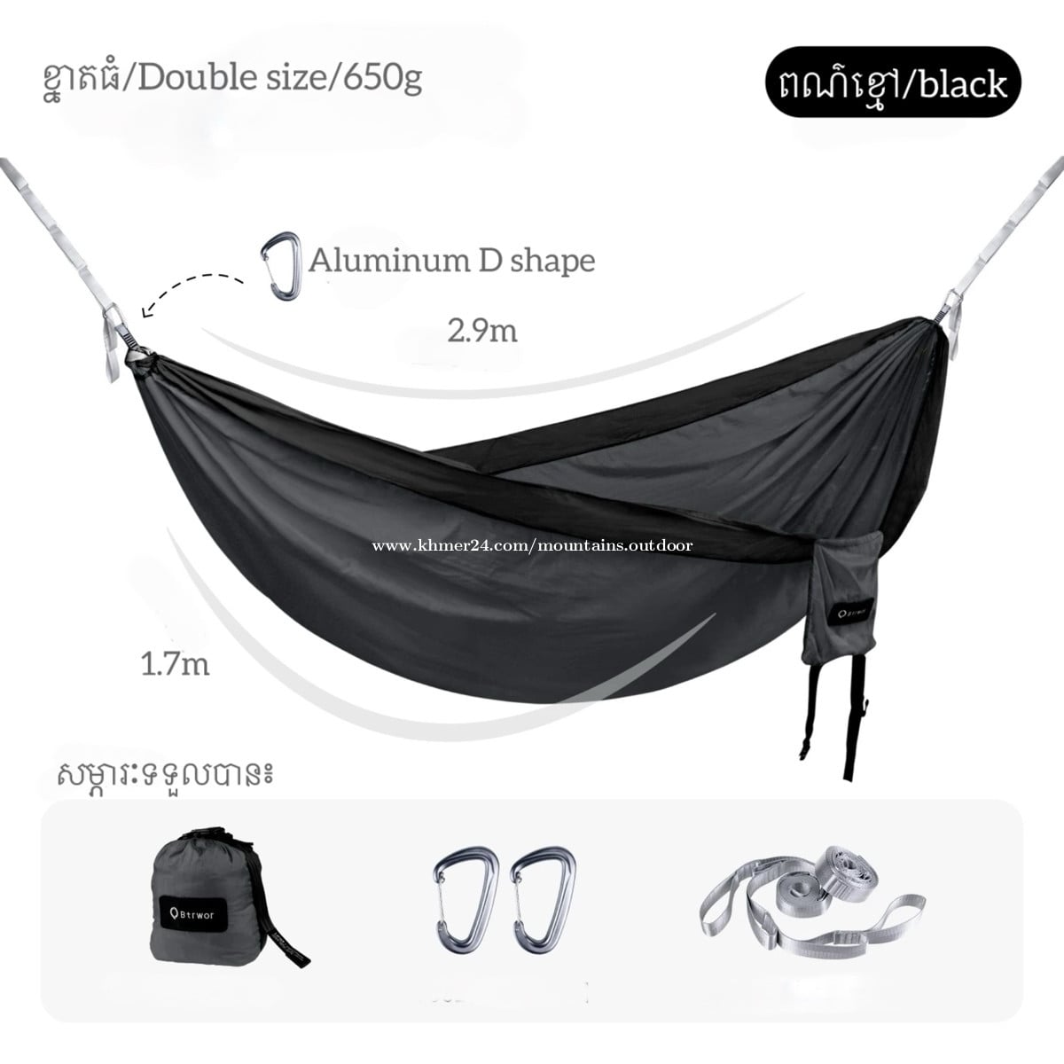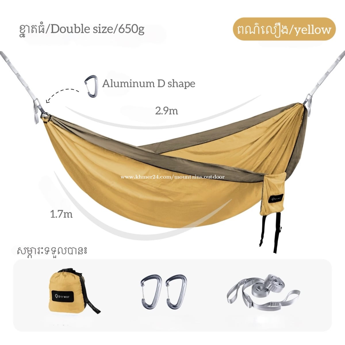 Coming soon • Weight Capacity: 200 kg • Material: 70D (210T) Nylon + Anodized 6061 Aluminum • Size: 2.9 m × 1.7 m • Installation Distance: 2.5 m – 5 m • Product Weight: 650 g ————————————————————— *Contact:0966381xxxClick To Call/https://t.me/mountains_outdoor *Address:Borey Sorlar, 7A Street 371, Phnom Penh