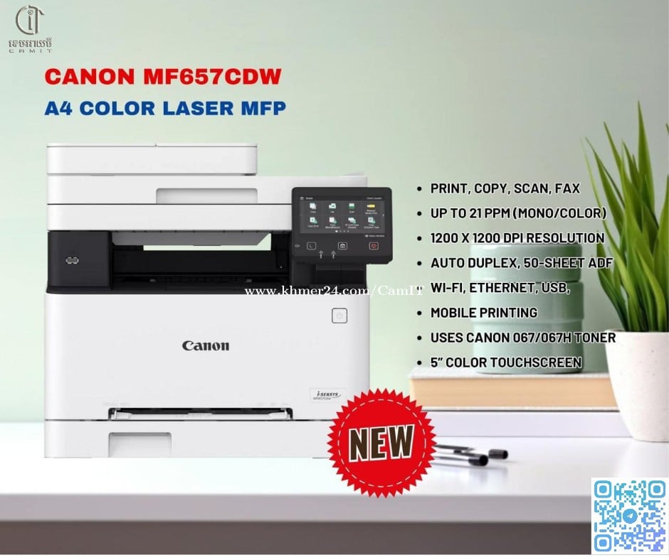 Canon MF657Cdw – Smart Color Laser Printer Perfect for offices that need high-quality printing with all-in-one features. 🖨️ Print | 📑 Copy | 📠 Scan | 📠 Fax ⚡️ Speed: Up to 21 ppm (Mono/Color) 🖥️ 5” Touchscreen | 📲 Wi-Fi & Mobile Print 📄 Auto Duplex + 50-sheet ADF 🔧 Reliable and easy to use 🧃 Uses Canon 067 / 067H toner ____________________________ #555, ផ្លូវកម្ពុជាក្រោម ខាងកើតស្តុបសន្ធរម៉ុក៧០ម៉ែត្រ 012806xxxClick To Call | 070727xxxClick To Call https://t.me/CamIT_Computer / https://t.me/CamIT_Store https://goo.gl/maps/GaCz94s6snSDZQBc8