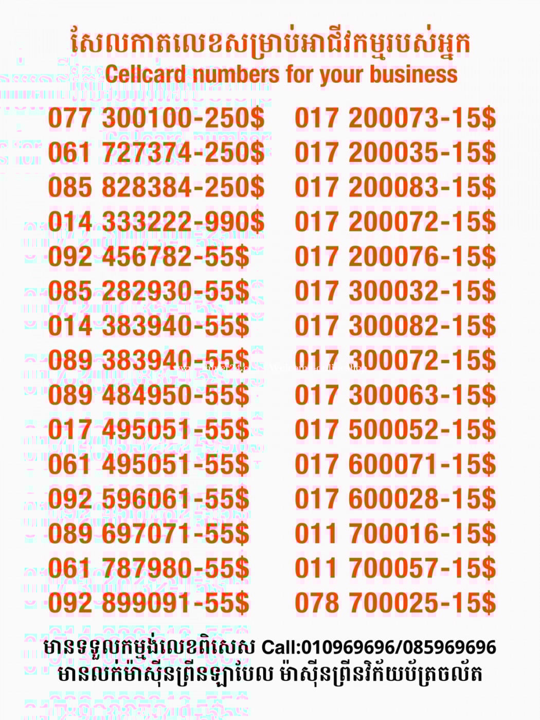 មានលក់លេខពិសេស មានទទួលកម្មង់លេខពិសេស មានលក់ម៉ាស៊ីនព្រីនឡាបែលចល័ត មានលក់ម៉ាស៊ីនព្រីនវិក័យប័ត្រចល័ត មានលក់សម្ភារៈប្រើប្រាស់ក្នុងគ្រួសារ Smart Prime II 1=30$ Smart hero 1=40$ ទូរសព្ទថ្មីក្នុងប្រអប់ លក់ធូរៗរហូតអស់ពីស្តុក អាចប្រើជាឧបករណ៍សម្រាប់ស៊ែរ wifi បាន ទំនាក់ទំនង(ខ្មែរ | English | 中文):010969696 | 085969696 Telegram: https://t.me/W9696 Telegram group: https://t.me/konkonnada អាសយដ្ឋាន:ផ្ទះលេខ២៣ ផ្លូវបេតុងលេខ១ ភូមិទួលពង្រ សង្កាត់ចោមចៅ ខណ្ឌពោធិ៍សែនជ័យ រាជធានីភ្នំពេញ ទីតាំង https://goo.gl/maps/8moqW4iTHUfJEvWQ9 ដើម្បីស្វែងរកលេខអាជីវកម្មដែលលោកអ្នកពេញចិត្ត សូមចូលទៅកាន់:https://www.khmer24.com/Welcome-onlineshop
