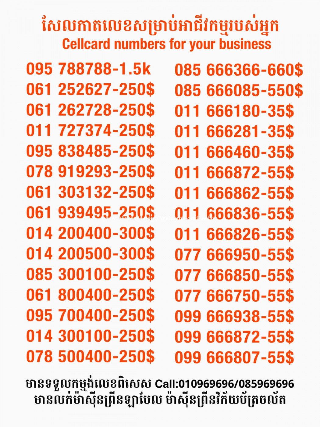 មានលក់លេខពិសេស មានទទួលកម្មង់លេខពិសេស មានលក់ម៉ាស៊ីនព្រីនឡាបែលចល័ត មានលក់ម៉ាស៊ីនព្រីនវិក័យប័ត្រចល័ត មានលក់សម្ភារៈប្រើប្រាស់ក្នុងគ្រួសារ Smart Prime II 1=30$ Smart hero 1=40$ ទូរសព្ទថ្មីក្នុងប្រអប់ លក់ធូរៗរហូតអស់ពីស្តុក អាចប្រើជាឧបករណ៍សម្រាប់ស៊ែរ wifi បាន ទំនាក់ទំនង(ខ្មែរ | English | 中文):010969696 | 085969696 Telegram: https://t.me/W9696 Telegram group: https://t.me/konkonnada អាសយដ្ឋាន:ផ្ទះលេខ២៣ ផ្លូវបេតុងលេខ១ ភូមិទួលពង្រ សង្កាត់ចោមចៅ ខណ្ឌពោធិ៍សែនជ័យ រាជធានីភ្នំពេញ ទីតាំង https://goo.gl/maps/8moqW4iTHUfJEvWQ9 ដើម្បីស្វែងរកលេខអាជីវកម្មដែលលោកអ្នកពេញចិត្ត សូមចូលទៅកាន់:https://www.khmer24.com/Welcome-onlineshop