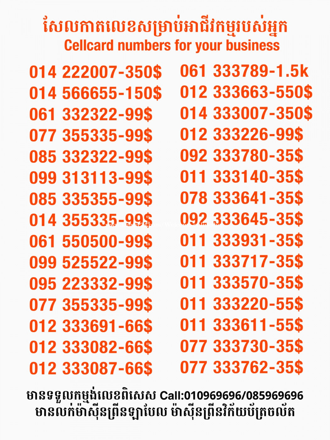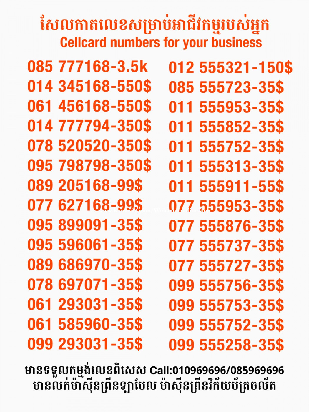 មានលក់លេខពិសេស មានទទួលកម្មង់លេខពិសេស មានលក់ម៉ាស៊ីនព្រីនឡាបែល មានលក់ម៉ាស៊ីនព្រីនវិក័យប័ត្រ មានលក់សម្ភារៈប្រើប្រាស់ក្នុងគ្រួសារ Smart Prime II 1=30$ Smart hero 1=40$ ទូរសព្ទថ្មីក្នុងប្រអប់ លក់ធូរៗរហូតអស់ពីស្តុក អាចប្រើជាឧបករណ៍សម្រាប់ស៊ែរ wifi បាន ទំនាក់ទំនង(ខ្មែរ | English | 中文):010969696 | 085969696 Telegram: https://t.me/W9696 Telegram group: https://t.me/konkonnada អាសយដ្ឋាន:ផ្ទះលេខ២៣ ផ្លូវបេតុងលេខ១ ភូមិទួលពង្រ សង្កាត់ចោមចៅ ខណ្ឌពោធិ៍សែនជ័យ រាជធានីភ្នំពេញ ទីតាំង https://goo.gl/maps/8moqW4iTHUfJEvWQ9 ដើម្បីស្វែងរកលេខអាជីវកម្មដែលលោកអ្នកពេញចិត្ត សូមចូលទៅកាន់:https://www.khmer24.com/Welcome-onlineshop
