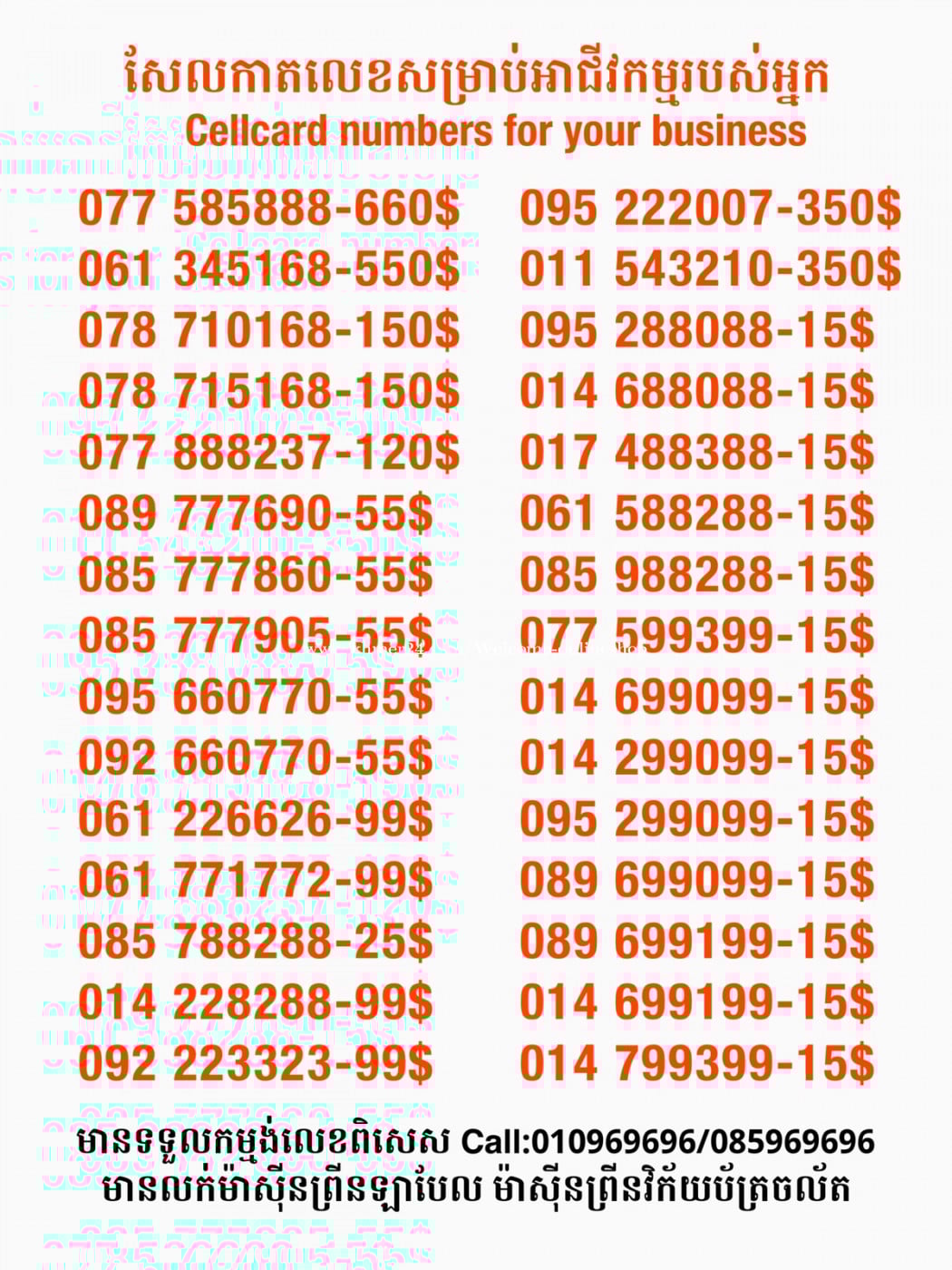 មានលក់លេខពិសេស មានទទួលកម្មង់លេខពិសេស មានលក់ម៉ាស៊ីនព្រីនឡាបែលចល័ត មានលក់ម៉ាស៊ីនព្រីនវិក័យប័ត្រចល័ត មានលក់សម្ភារៈប្រើប្រាស់ក្នុងគ្រួសារ Smart Prime II 1=30$ Smart hero 1=40$ ទូរសព្ទថ្មីក្នុងប្រអប់ លក់ធូរៗរហូតអស់ពីស្តុក អាចប្រើជាឧបករណ៍សម្រាប់ស៊ែរ wifi បាន ទំនាក់ទំនង(ខ្មែរ | English | 中文):010969696 | 085969696 Telegram: https://t.me/W9696 Telegram group: https://t.me/konkonnada អាសយដ្ឋាន:ផ្ទះលេខ២៣ ផ្លូវបេតុងលេខ១ ភូមិទួលពង្រ សង្កាត់ចោមចៅ ខណ្ឌពោធិ៍សែនជ័យ រាជធានីភ្នំពេញ ទីតាំង https://goo.gl/maps/8moqW4iTHUfJEvWQ9 ដើម្បីស្វែងរកលេខអាជីវកម្មដែលលោកអ្នកពេញចិត្ត សូមចូលទៅកាន់:https://www.khmer24.com/Welcome-onlineshop