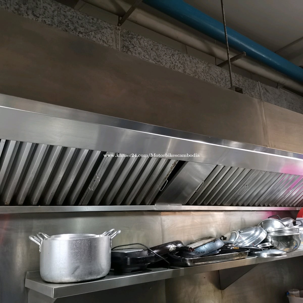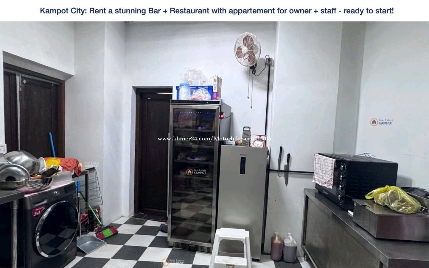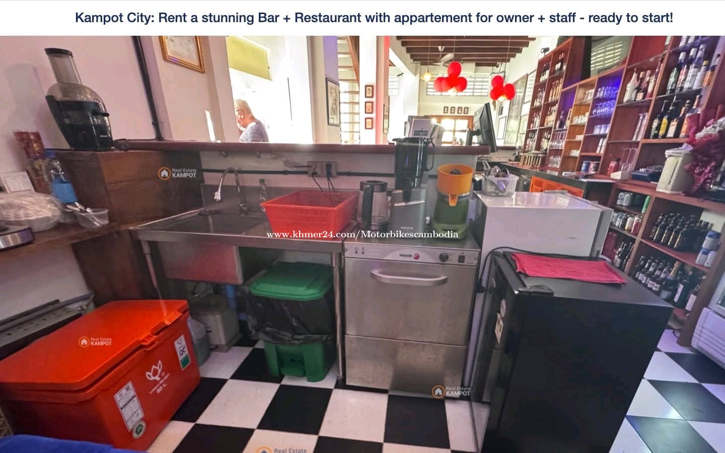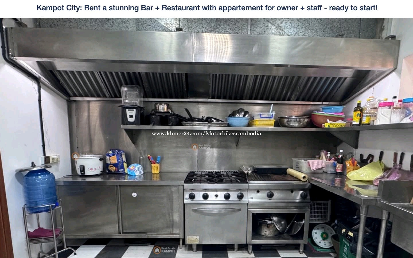Complete commercial kitchen for sale, including oven, gas grill, wine cooler, new freezer, two stainless steel refrigerated display cases, glasswasher, double stainless steel sink, sliding door cabinets, complete range hood, pots, pans, dishes, cutlery, rice cooker, washing machine, grinder, and much more. Available individually or as a complete unit in Kampot city center.