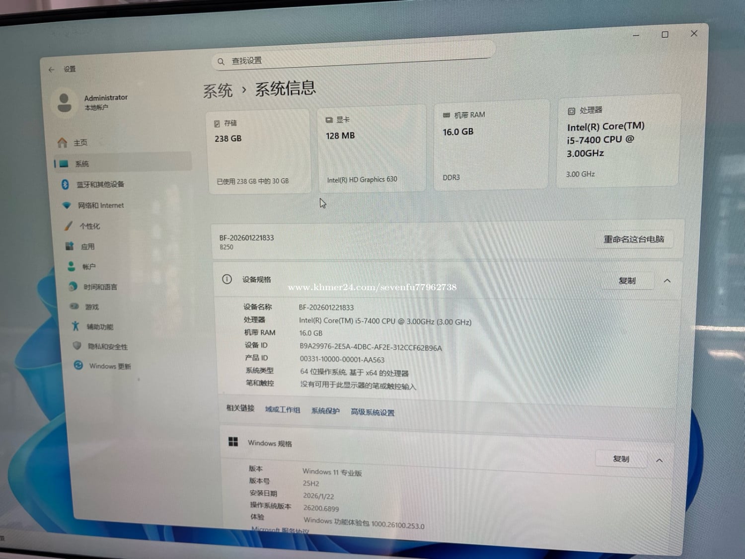 • CPU (ខួរក្បាល): Intel Core i5-7400 @ 3.00GHz 👉 ល្អសម្រាប់ការងារទូទៅ ការិយាល័យ ការរៀន និងប្រើកម្មវិធីមធ្យមៗ • RAM: 16GB DDR3 👉 អាចបើកកម្មវិធីច្រើនពេលតែមួយ (multitasking) ដោយមិនយឺត 👉 ល្អសម្រាប់ Chrome tabs ច្រើន, Zoom, Word/Excel, Photoshop មធ្យម • Storage (អង្គចងចាំ): 238GB 👉 ផ្ទុកឯកសារ វីដេអូ រូបភាព និងកម្មវិធី 👉 ប្រើទៅហើយប្រហែល 30GB (នៅសល់ច្រើន) • Graphics (ក្រាហ្វិក): Intel HD Graphics 630 👉 មើលវីដេអូ Full HD / YouTube 👉 មិនសមស្របសម្រាប់ game ធ្ងន់ៗ ឬ 3D rendering ធំៗ • ប្រព័ន្ធប្រតិបត្តិការ: Windows 11 Pro (64-bit) 👉 ប្រើសម្រាប់ការងារអាជីវកម្ម មានសុវត្ថិភាព និងគ្រប់គ្រងបានល្អ ⸻ 🧑💼 មុខងារដែលវាអាចធ្វើបានល្អ ✅ ការងារការិយាល័យ (Word, Excel, PowerPoint) ✅ រៀនអនឡាញ / Zoom / Google Meet ✅ ប្រើអ៊ីនធឺណិត និង Email ✅ មើលវីដេអូ / ស្តាប់តន្ត្រី ✅ កែរូបភាពកម្រិតមធ្យម (Photoshop, Canva) ✅ ប្រើកម្មវិធីគណនេយ្យ ឬ POS