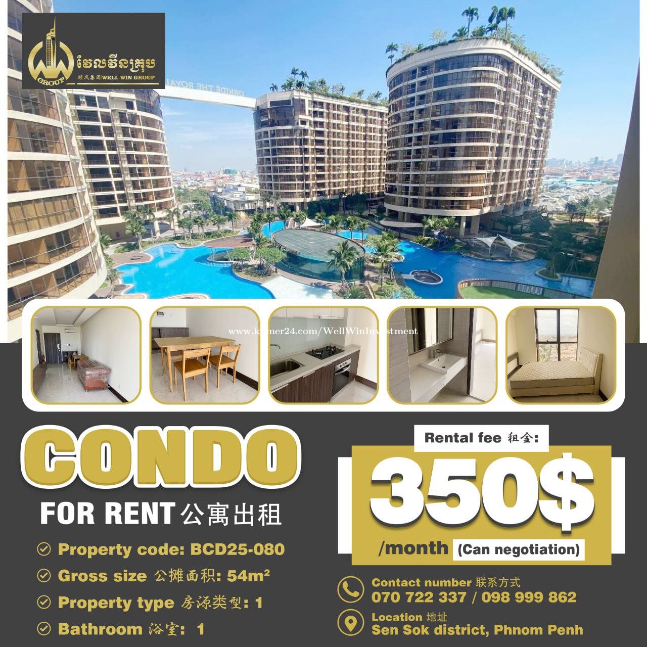 Condo for rent 公寓出售 Property code: BCD25-080 Rental fee 租金: 350$ (Can negotiation) Gross size 公摊面积: 54m² Property type 房源类型: 1 Bathroom 浴室: 1 Location 地址: Sen Sok district, Phnom Penh Contact number 联系方式: 070722xxxClick To Call / 098999xxxClick To Call