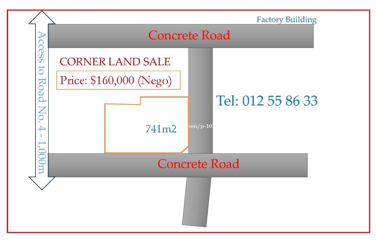 Corner Land For Sale Near National Road No. 4. Khan Porsenchey. • Asking price: US$ 160,000 (Negotiable) • Total land size: 741m2 (Hard Title Deed) • This land standing on concrete road and in development area • Good Land Shape • Electricity and water can connection • Many accessible roads • Good land for build villa, warehouse, room for rent or buy for investment. For more details please contact us now !!! Tel: 012558xxxClick To Call (Telegram) https://maps.app.goo.gl/wRgzChm7SfLbiiPg6?g_st=it