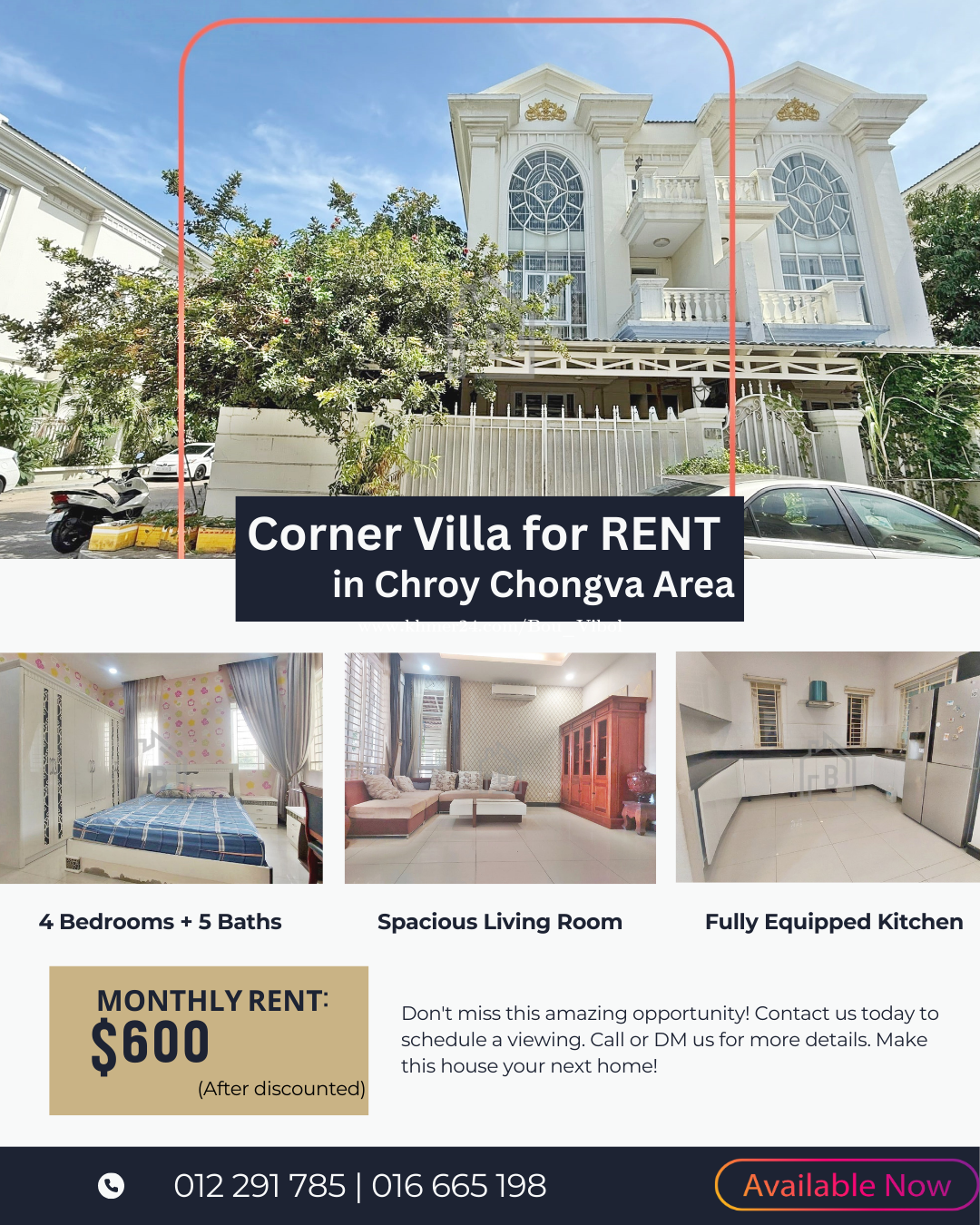 Corner Twin Villa 4 Bedrooms for RENT in Chroy Chongva Area ๐National Road 6A, Prek Leap House Details: โ๏ธ Community Gate (Borey) โ๏ธ Floor: 3th Story โ๏ธ Land size : 08 x 22m โ๏ธ House size : 06m x 14m โ๏ธ Bedrooms : 4 โ๏ธ Bathrooms : 5 โ๏ธ Western Kitchen : 2 โ๏ธ Living Room : 1 โ๏ธ Facing to south โ๏ธ Fully Furnished โ๏ธ 24/7 Security Guards ๐ทSpecials Offered: only $600/month Now!! _______________________________________________ * Electricity & Water pay direct to government rate * Lease period & deposit (negotiable) โ๏ธPLEASE CONTACE US: +8551229xxxClick To Call5 / +8551666xxxClick To Call8 +Telegram: https://t.me/vibolbou012 +WhatsApp: https://wa.link/2zexez +WeChat ID: vb016665xxxClick To Call