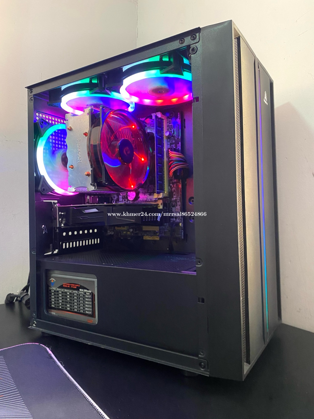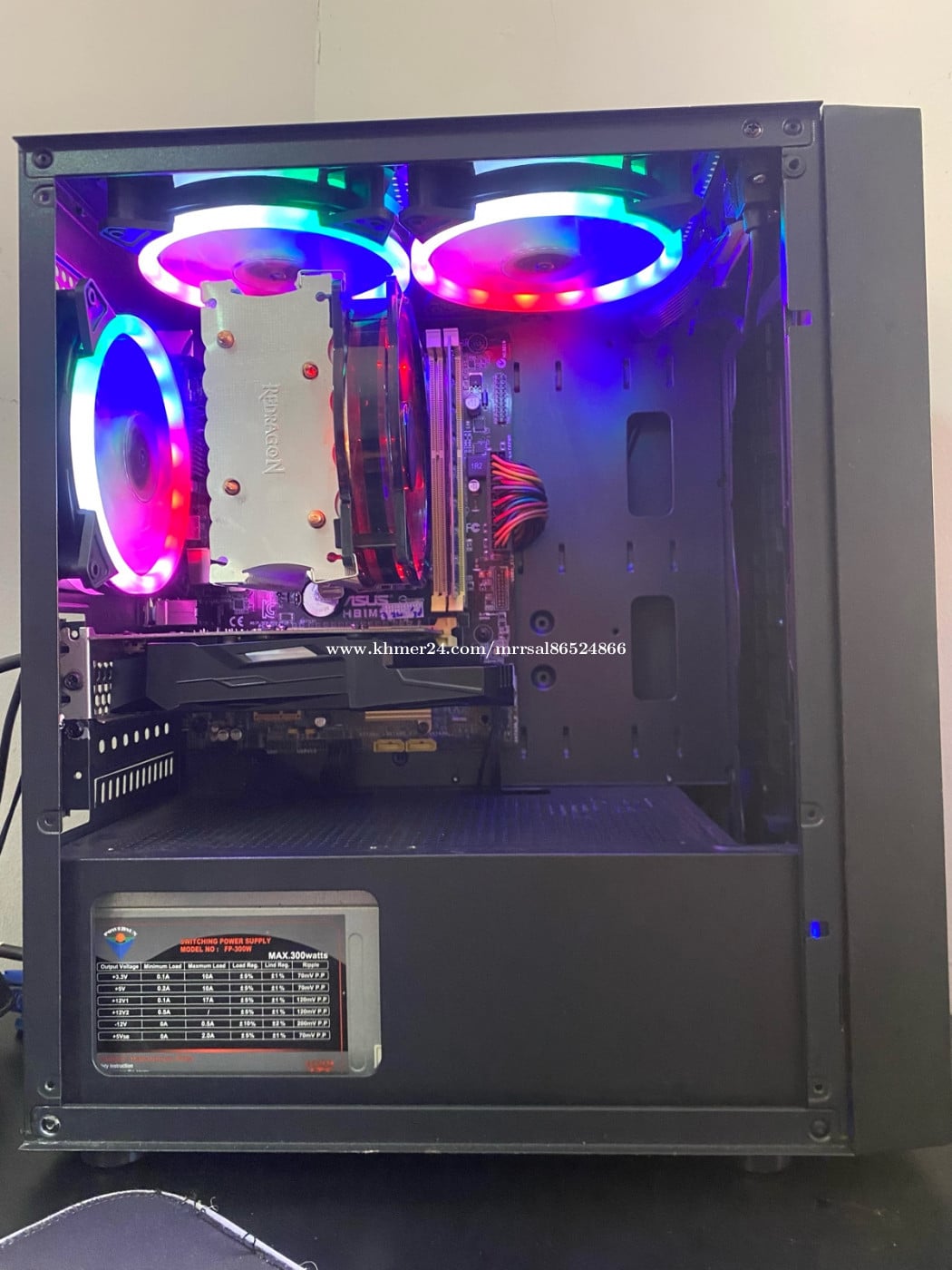 CPU : Intel Core i5 4590 (3.30GHz) RAM : SK Hynix DDR3L 8G (1600MHz) MB : Asus H81M-D (4th Generation) SSD : Colorful 128G (Window10Pro) HDD : SEAGATE 500G (Drive D SATA) PSU : POWERSUN 300W (Original Full) CASE : SEGOTEP M-ATX RGB (កញ្ចក់ចំហៀង) COOLER : RED DRAGON 120 (RGB RED) FAN CASE : H.I (RGB Rainbow X3) GPU : MAXSUN GT 1030 2G (GDDR5)