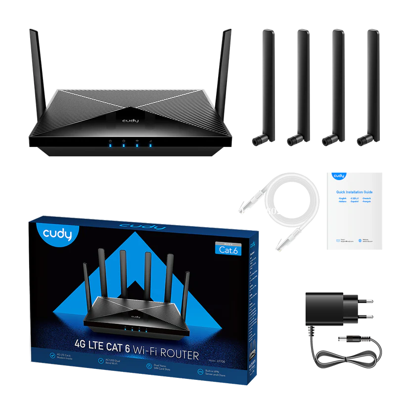 4G Cat. 6 with Max 300 Mbps DL 1 DL 2-Carrier Aggregation, MIMO 2 4-Stream Dual-Band Wi-Fi 5 867 Mbps + 300 Mbps Wi-Fi 3 4× Gigabit Ethernet Ports 2× Nano SIM Slots Detachable Cellular Antennas Cudy Mesh, VPN Server and Client Cudy App, Cloud Control 2 Years warranty