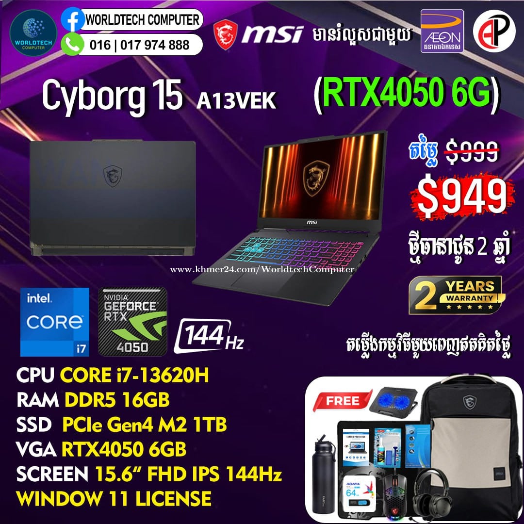 Cyborg15 A13VEK i7-13620H Ram 16G M2 1TB RTX4050 6G 15.6" 144Hz New=949$ Cyborg15 A13VEK i7-13620H Ram 16G M2 512GB RTX4050 6G 15.6" 144Hz New=899$ Cyborg15 A13UC Cyborg15 A13UC i7-13620H Ram 16G M2 512GB RTX3050 4G 15.6" 144Hz New=749$ Cyborg15 A13UC i5-13420H Ram 8G M2 512GB RTX3050 4G 15.6" 144Hz New=649$ Cyborg15 A13UC i5-13420H Ram 16G M2 512GB RTX3050 4G 15.6" 144Hz New=699$ ថ្មីធានា២ឆ្នាំ Telegram 017974xxxClick To Call , 011777xxxClick To Call