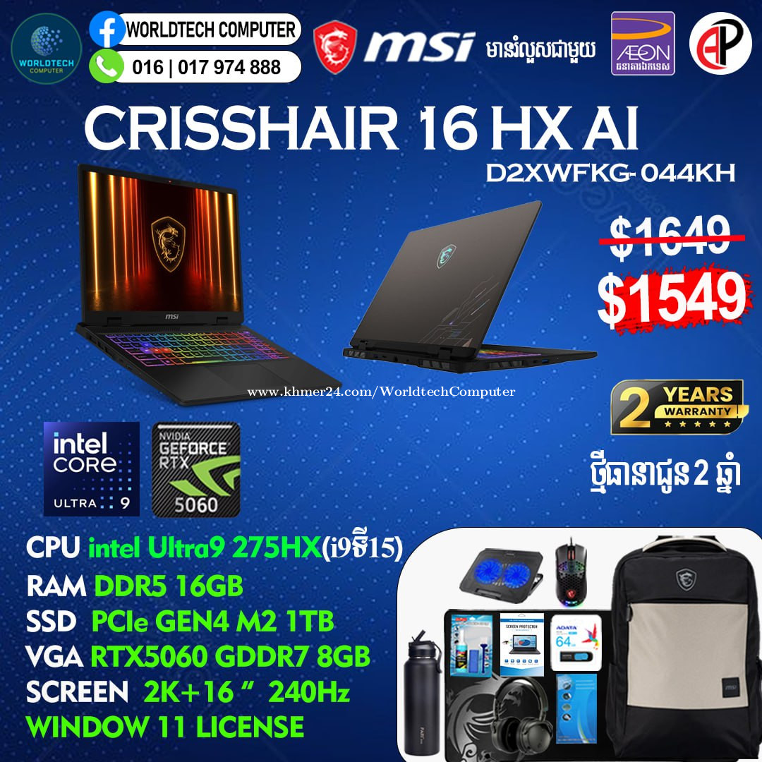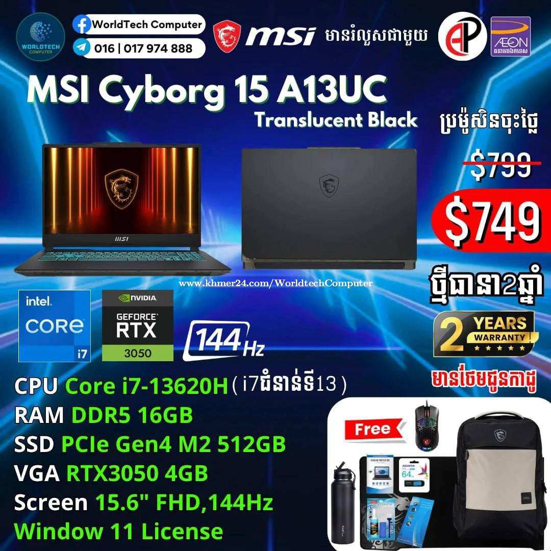 New (Gaming+Design) 2025 ធានា2ឆ្នាំ Warranty 2years from MSI Cambodia Cyborg15 i5-13420H 8G M2 512GB RTX3050 4G 15.6" 144Hz New=649$ Cyborg15 i5-13420H 16G M2 512GB RTX3050 4G 15.6" 144Hz New=699$ Cyborg15 i7-13620H 16G M2 512GB RTX3050 4G 15.6" 144Hz New=749$ Cyborg17 Cyborg17 i7-13620H 16G M2 512GB RTX5050 8G 17.3" 144Hz New=1049$ Cyborg17 i7-13620H 16G M2 512GB RTX5060 8G 17.3" 144Hz New=1199$ Telegram: 017974xxxClick To Call , 011777xxxClick To Call ទីតាំងហាង: ផ្ទះ39Eo ផ្លូវ257 ទឹកល្អក់3 ទួលគោក ភ្នំពេញ (ខាងលិចស្តុបទេពផនប្រហែល 300ម)។ Location: #39E0 St257, Tuol Kouk , Tuek L'ak Bei , Phnom Penh