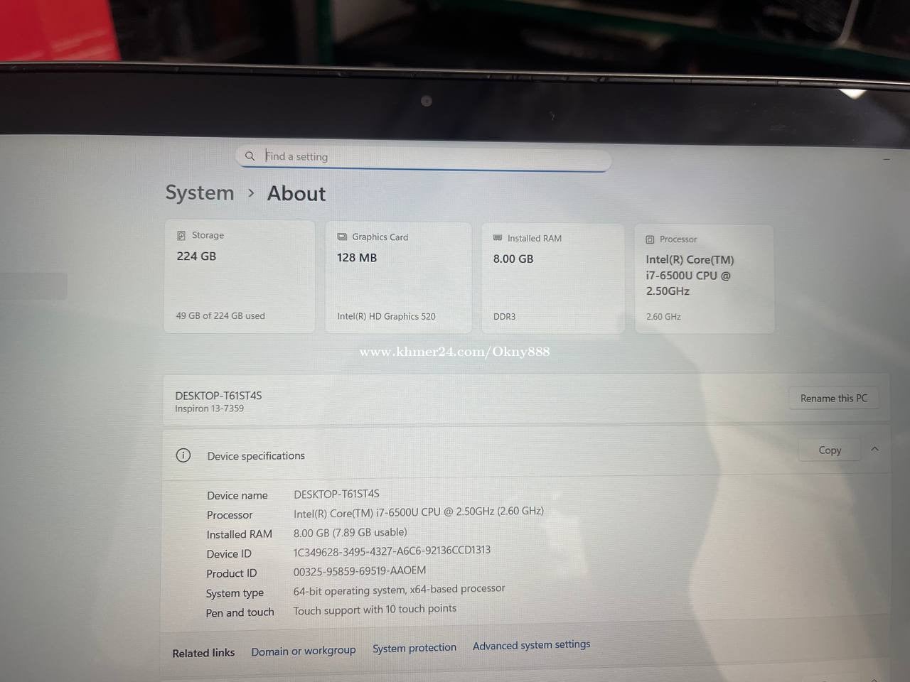 Dell Inspiron 13-7359 CPU:i7 6500U,Ram:8Gb,SS:256Gb Screen: 13inch HD with Touch Screen Battery: Excellent Keyboard: Light Free: Mouse,Mouse pad ======ជៀសវាងការបោកប្រាស់ សូមស្វែករកពត័មានអំពីអ្នកលក់======== ➡️មើលហើយត្រូវ ចិត្តចាំទូទាត់💰 ➡️ ផ្ញើជូន ២៤ខេត្តក្រុង/មកមើលដល់ទីតាំងក៏បាន 📭 សាកសួរឬ ទំនាក់ទំនងអ្នកលក់ ☎️តេលេក្រាម: 070666xxxClick To Call/077881xxxClick To Call, @Okny888 Link: https://t.me/Okny888 Facebook: okny168 Youtube: https://www.youtube.com/@Iamsolver ទីតាំង: ផ្ទះលេខ៤១,ផ្លូវ០៦,បុរីជារី,ក្រោយ សាលា ប៊ែលធីផ្លូវជាតិលេខ៣,ភ្នំពេញ។ Map: https://goo.gl/maps/cDHZ9TDt7hfQ5mzv9