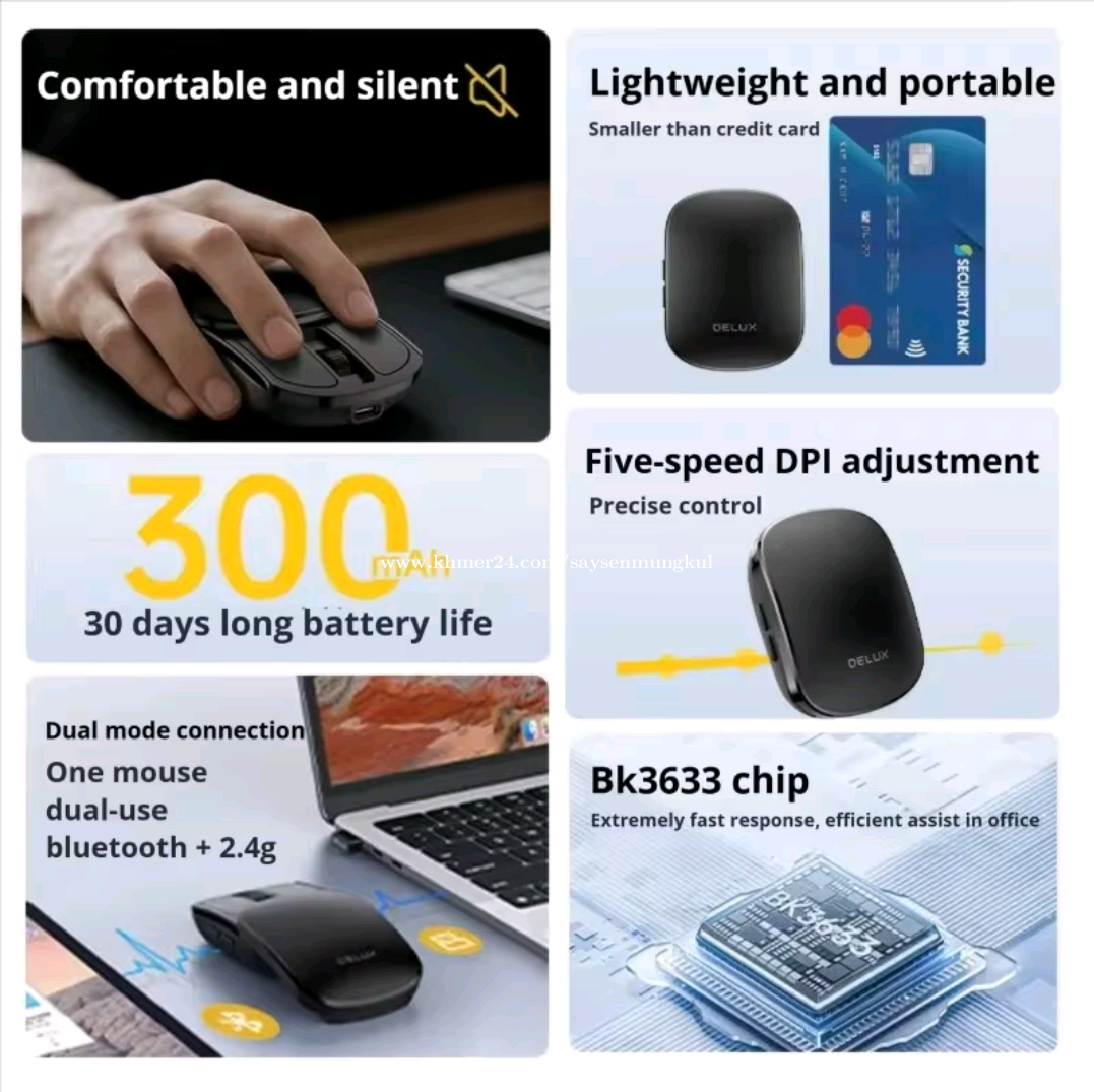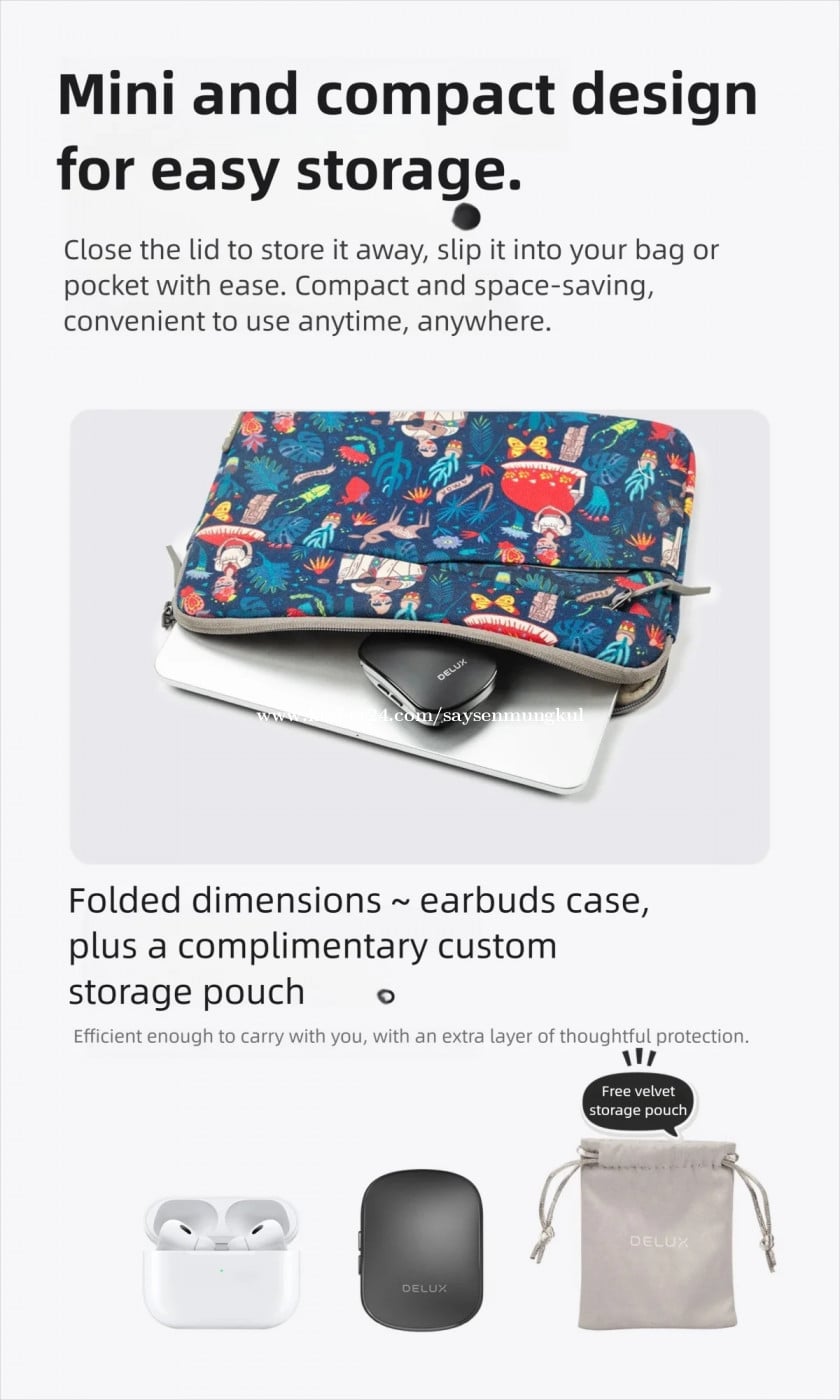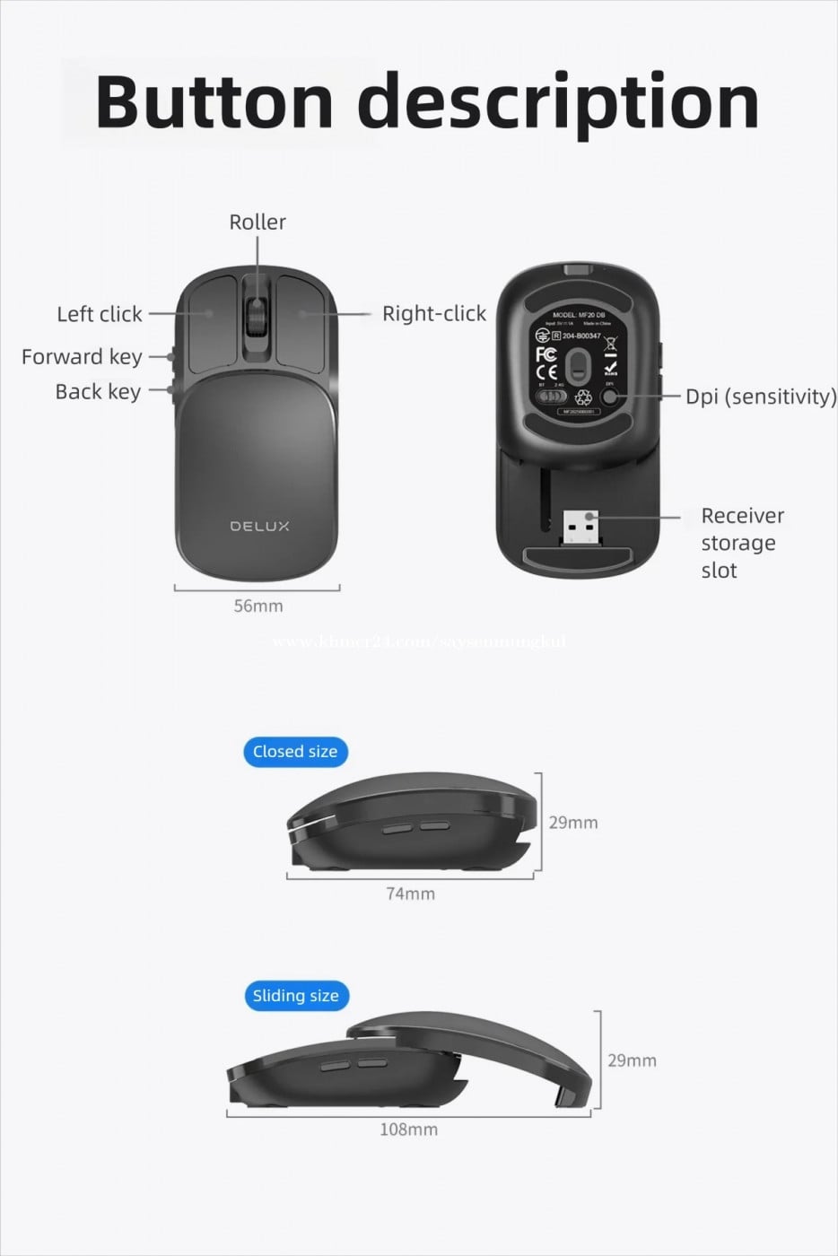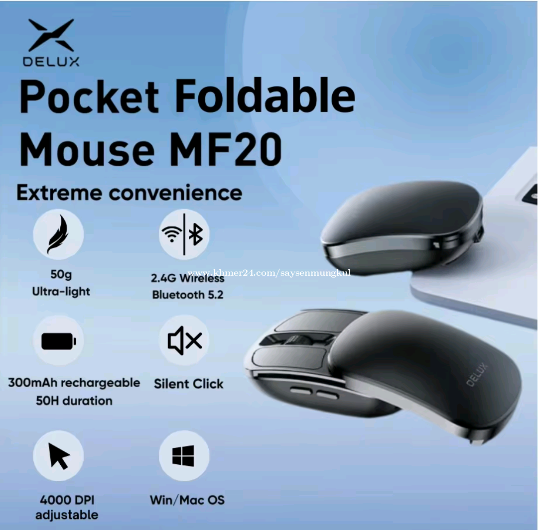 Mouse តូចងាយស្រួលដាក់តាមខ្លួន សំរាប់បងប្អូនធ្វើការងារចល័តច្រើន អាចហូតមាន សន្ទះការពារគ្រាប់ចុច Delux MF20 Wireless Folding Mouse Ultra-light 50g Portable Silent Click 2.4G Bluetooth for Tablet Windows Mac OS Pocket-Friendly Spec products : M13_K35 តម្លៃ Price:25$ សូមទំនាក់ទំនងទិញ Sale: https://t.me/Mungkul077 Channel: https://t.me/blackholesstore Facebook: https://www.facebook.com/profile.php?id=61556326415298&mibextid=ZbWKwL