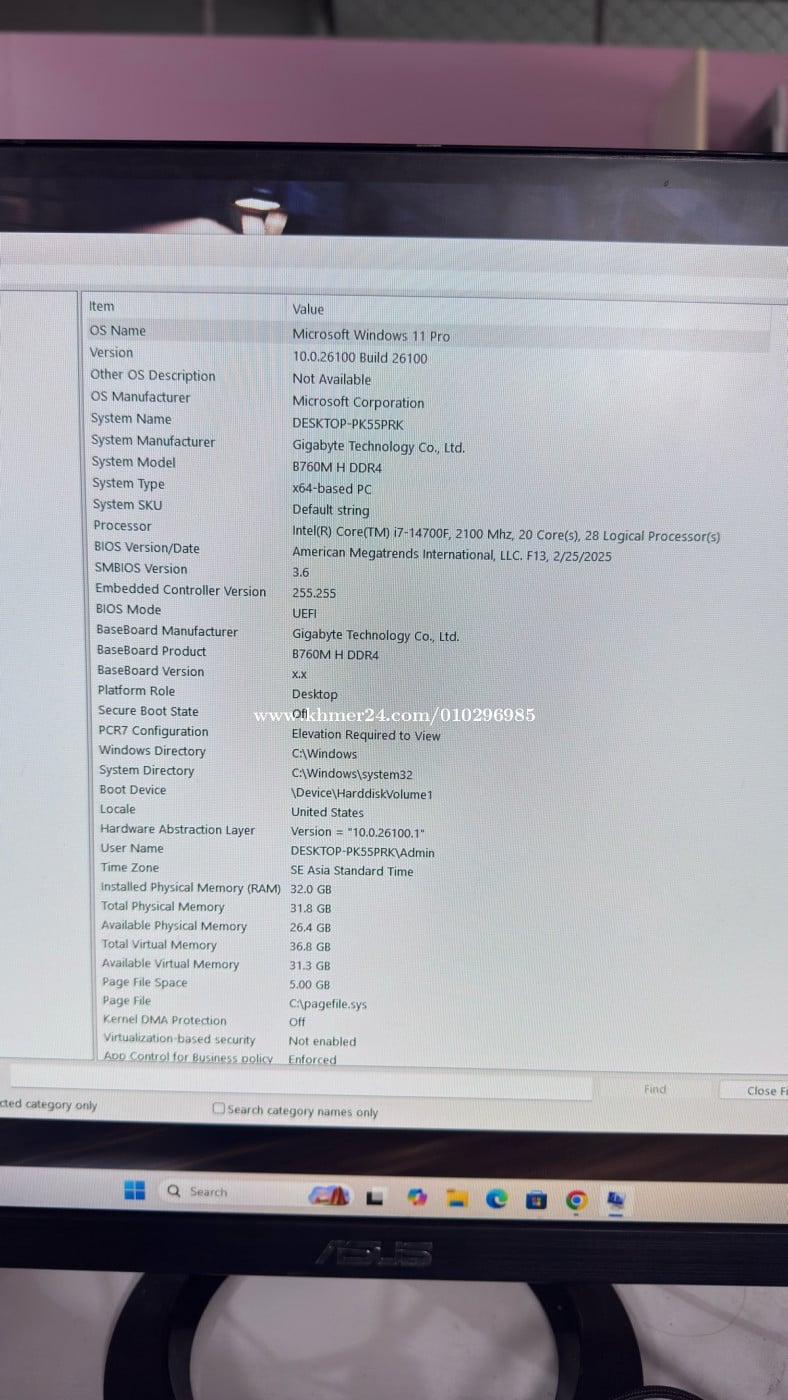 Desktop Gaming specs below: ➡️CPU: Intel Core i7-14700F speed @2.10GHz to @4.49GHz (20Corsz, 28Thread) ➡️RAM: 32G x2 3200MHz brand Corsair ➡️Mainboard: B760M H DDR4 (MSI) ➡️VGA card: GTX 1060 GDDR5 6GB ➡️Monitor: Asus VZ279HE 1920x1080 27” 75MHz ➡️Case: Gaming has FAN RGB 4pieces CPU FAN: Air cooler RGB ➡️Accessories: Free mouse keyboard RGB & Mousepad ➡️Storage: M.2 512G Model SPCC M.2 PCle SSD & Colorful CN600 512GB (2x) ➡️PSU: MODEL ATX-650W 80 PLUS ➡️Price: 771$ ➡️Warranty 30days ➡️Tel: 010296xxxClick To Call Join group telegram below: https://t.me/+bAISWOCCOsw3ODJl --------------------------------- អាសយដ្ឋាន: ភូមិ 05 សង្កាត់ 04 ក្រុងព្រះសីហនុ, ខេត្តព្រះសីហនុ (ក្រោយសាលាហ៊ុនសែនមិត្តភាព ហៅសាលាអូរ2 ទល់មុខអាគារខុនដូរ LZ) Address: Village 05, Commune 04, Sihanoukville, Province. Link google map below: លីងផែនទី Google នៅខាងក្រោមនេះ: https://maps.app.goo.gl/BrZM4EoDXwDiVULT7?g_st=ic