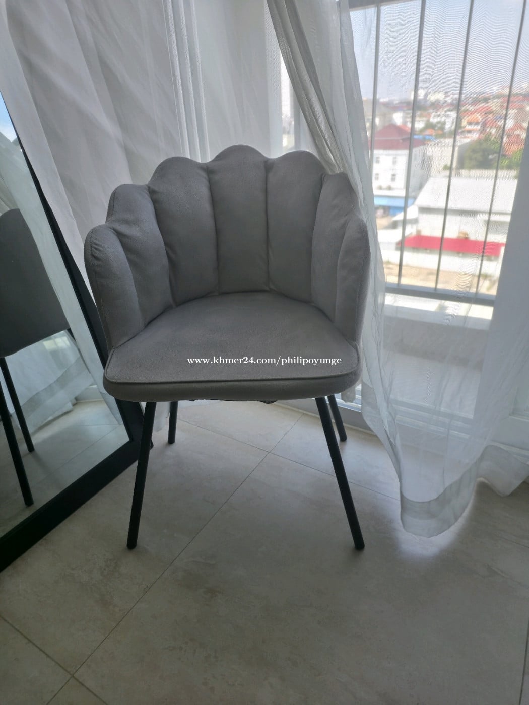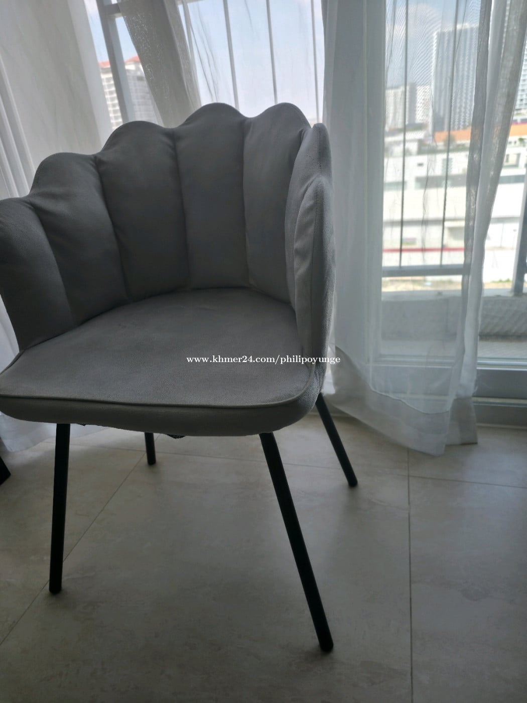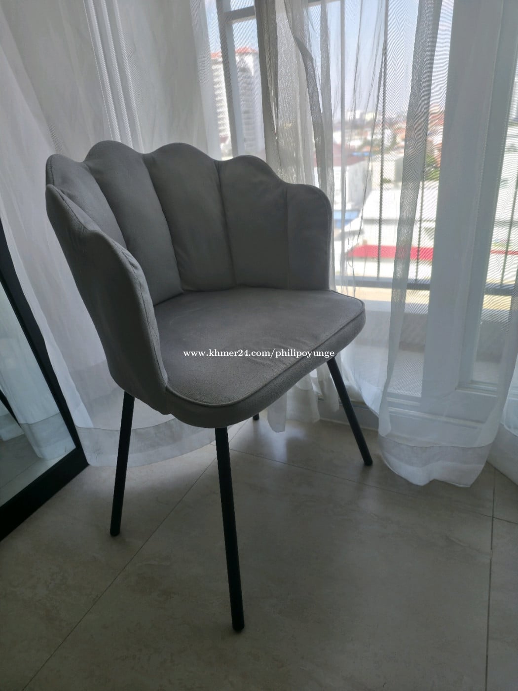 This is a grey flower-shaped armchair, velvet cover with black metal legs.