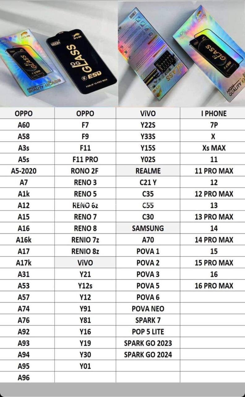 "OPPO: A60, A58, A3s, A5s, A5-2020, A7, A1k, A12, A15, A16, A16k, A17, A17k, A31, A53, A57, A74, A76, A92, A93, A94, A95, A96, F7, F9, F11, F11 PRO, RONO 2F, RENO 3, RENO 5, RENO 6z, RENO 7, RENO 8, RENIO 7z, RENIO 8z ViVo: Y21, Y12s, Y12, Y91, Y81, Y16, Y19, Y30, Y01, Y22S, Y33S, Y15S, Y02S Realme: C21 Y, C35, C55, C30 Samsung: A70 Techno: POVA 1, POVA 2, POVA 3, POVA 5, POVA 6, POVA NEO, SPARK 7, POP 5 LITE, SPARK GO 2023, SPARK GO 2024 Iphone: 6G/7G/8G (BL/WH), 6P/7P/8P (BL/WH), X, Xs MAX, 11, 11 PRO MAX, 12, 12 PRO MAX, 13, 13 PRO MAX, 14, 14 PRO MAX, 15, 15 PRO MAX, 16, 16 PRO MAX, 17,17Air, 17Pro, 17Pro max