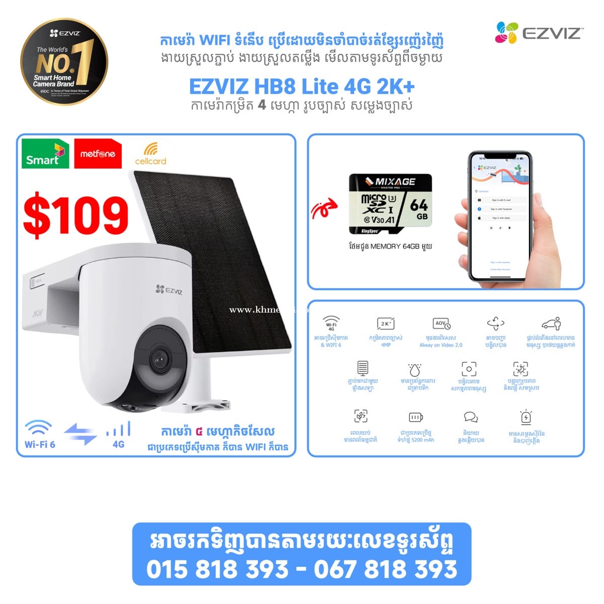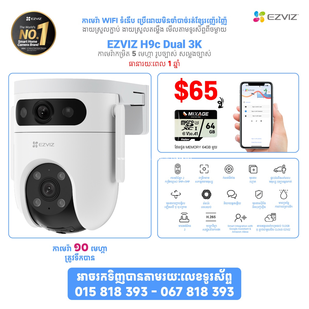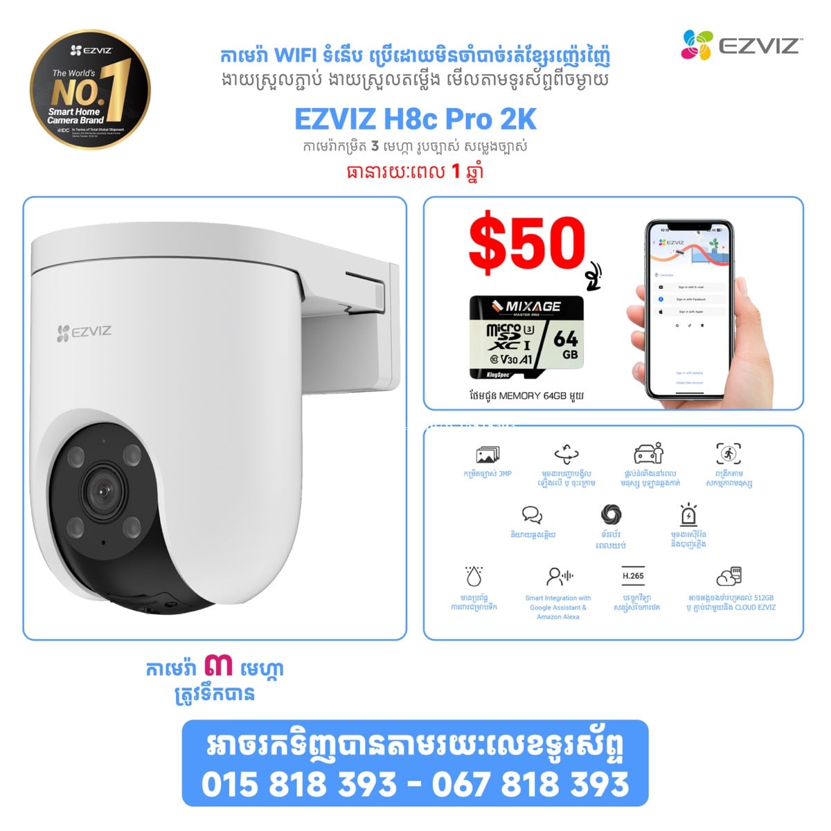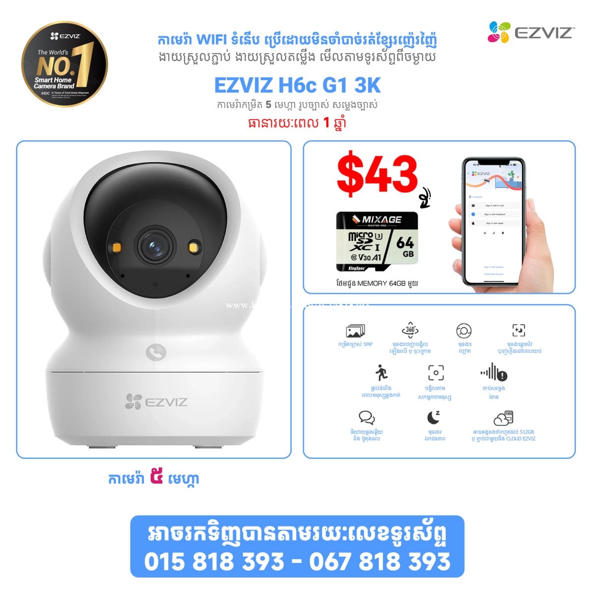 ម្តម្លៃពិសេស ជាមួយនឹង EZVIZ កាម៉េរាដែលមានគុណភាពខ្ពស់ ទទួលការពេញនិយមបំផុតពីអ្នកប្រើប្រាស់ ជាមួយមុខងារពិសេសៗជាច្រើនដូចជា 👉អាចភ្ជាប់ជាមួយទូរស័ព្ទបាន អាចបញ្ជាបង្វិលពីចម្ងាយបាន 👉ផ្តល់សញ្ញានៅពេលមានមនុស្សឆ្លងកាត់ 👉អាចថត 24ម៉ោងលើ 24 ម៉ោង 👉ប្រើ MEMORY ដើម្បីរក្សារទុកទិន្នន័យ 👉ធានាជូនរយះពេល ១ឆ្នាំ