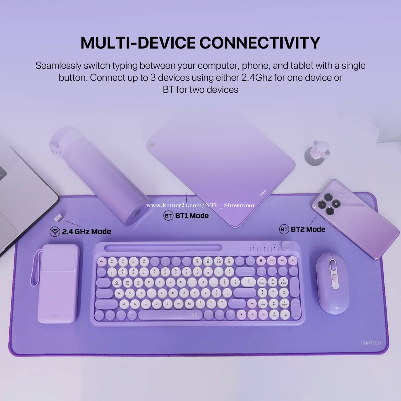 *Fantech GO MACHI 101 WK899 Wireless Mouse Keyboard Combo and Mouse Pad ✅ Dual Mode (2.4Ghz, BT) ✅ BT Version: 3.0 & 5.0 ✅ Connect Up To 3 Devices (2x BT, 1x2.4Ghz) ✅ 101 Keys, Volume Knob ✅ Mouse: 1,600 DPI ✅ Silent Click Mouse ✅ Keyboard Battery: 2*AAA (included) ✅ Mouse Battery: 1*AA (included) Color : Yellow , Blue, Pink, Purple 🥰warranty 1year