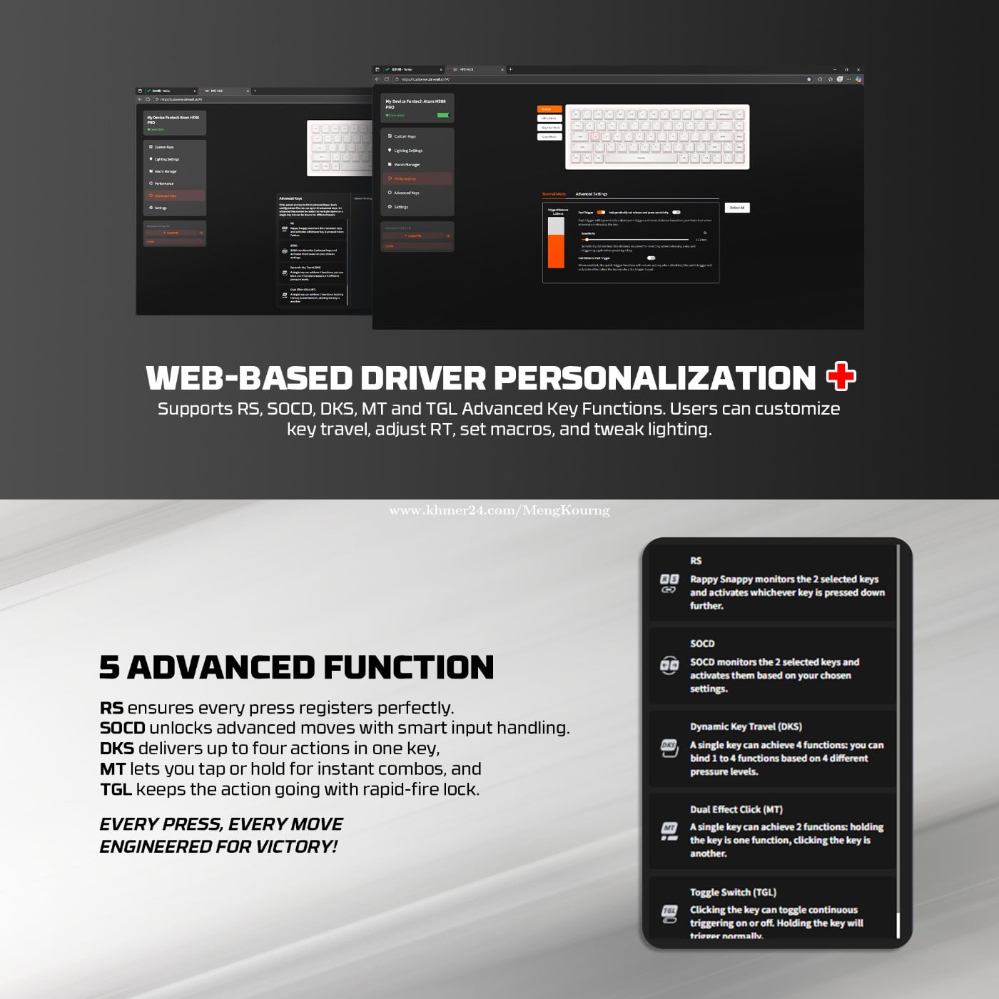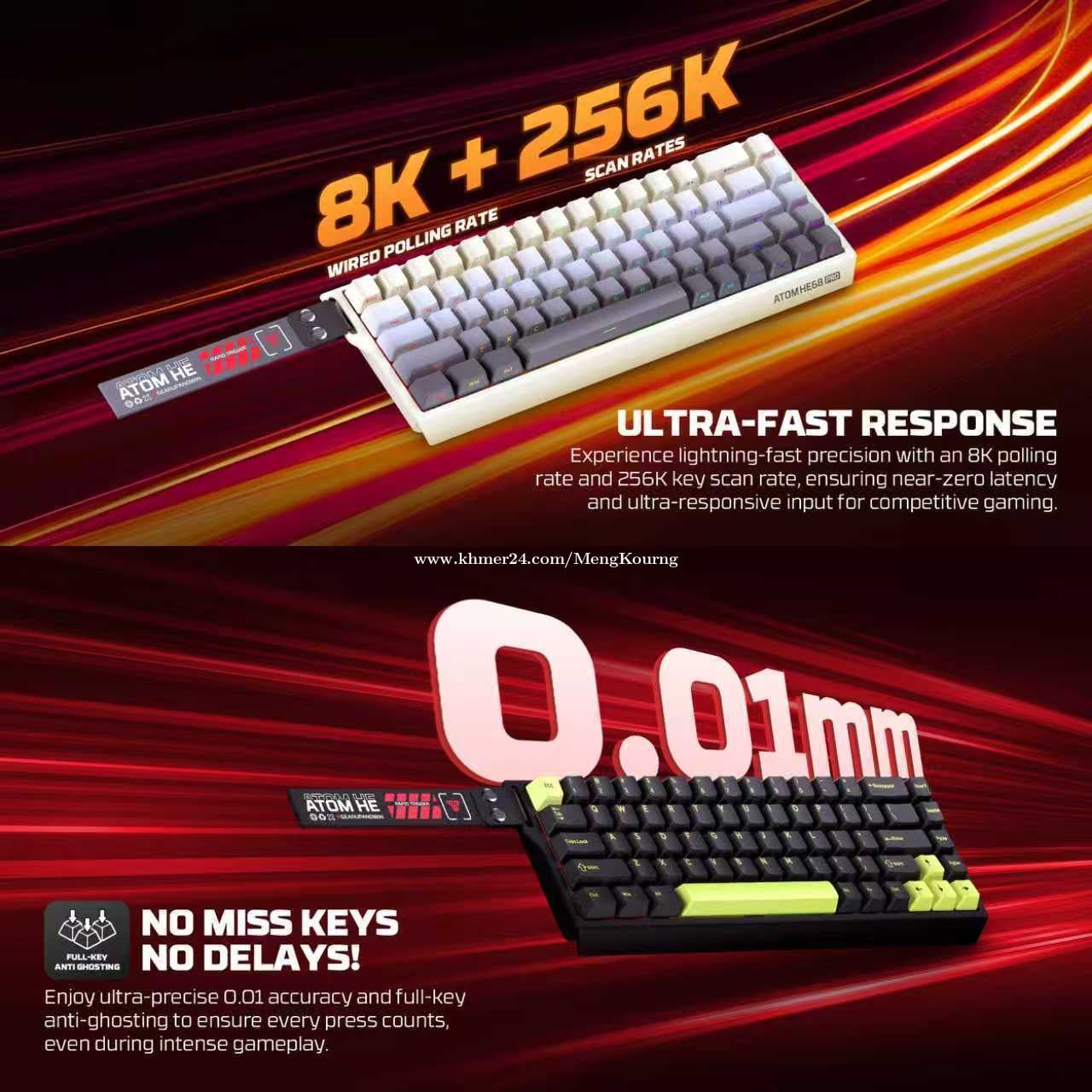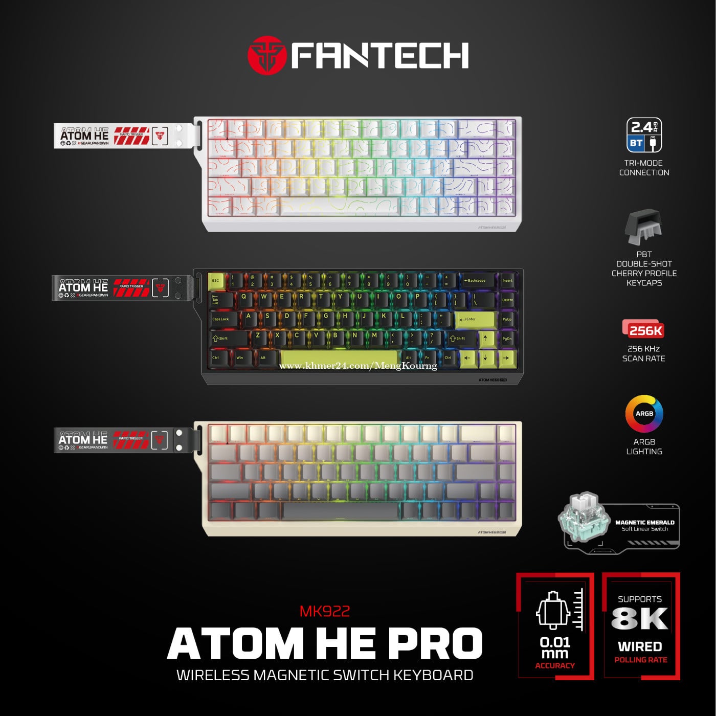 Fantech MK922 ATOM HE68 Pro Wireless MAGNETIC Switch Keyboard ✅Keyboard Magnetic Wireless Switch 68Keys 65% Hot-swappable ✅3 Mode Connection (BT5.3 3devices, Wireless 2.4GHz, Wired) ✅3750mah Battery, up to 42Hours ✅ Switch type: Emerald switch (linear) ✅Switch accuracy: 0.01mm ✅Rapid trigger: 0.1-3.4mm ✅Polling rate: 8000Hz, Scan rate: 32K ✅Full keys anti-ghosting ✅Personalization+ (Web based) ✅Cherry profile, PBT double-shot keycaps ✅ LED: ARGB (19 modes) Color : Mori Black , TOPO White , Retro Beige 👍1 year warranty *This price not include delivery 🛒កម្ម៉ង់ឥឡូវនេះ 👇👇👇 👉ផ្នែកលក់☎️012787xxxClick To Call https://t.me/cmksale1 👉ចូលរួមគ្រុបយើងខ្ញុំ https://t.me/+pMlYdQSBYkEyYTU1 👉ទំនិញរាប់ពាន់មុខក្នុងដៃអ្នក🌏cmkcomputer.com 🌐https://www.facebook.com/MengKourngComputer 🌐https://www.facebook.com/cambodiafantech