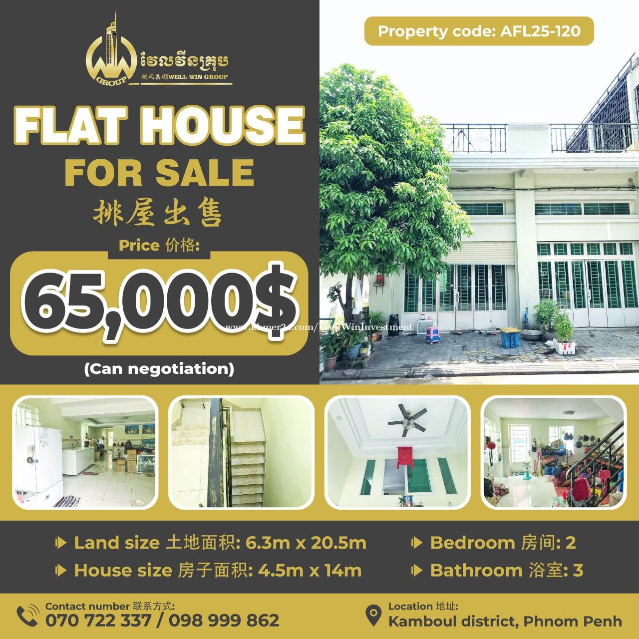 Flat house for sale 排屋出售 Property code: AFL25-120 Price 价格: 65,000$ (Can negotiation) Land size 土地面积: 6.3m x 20.5m House size 房子面积: 4.5m x 14m Bedroom 房间: 2 Bathroom 浴室: 3 Location 地址: Kamboul district, Phnom Penh Contact number 联系方式: 070722xxxClick To Call / 098999xxxClick To Call